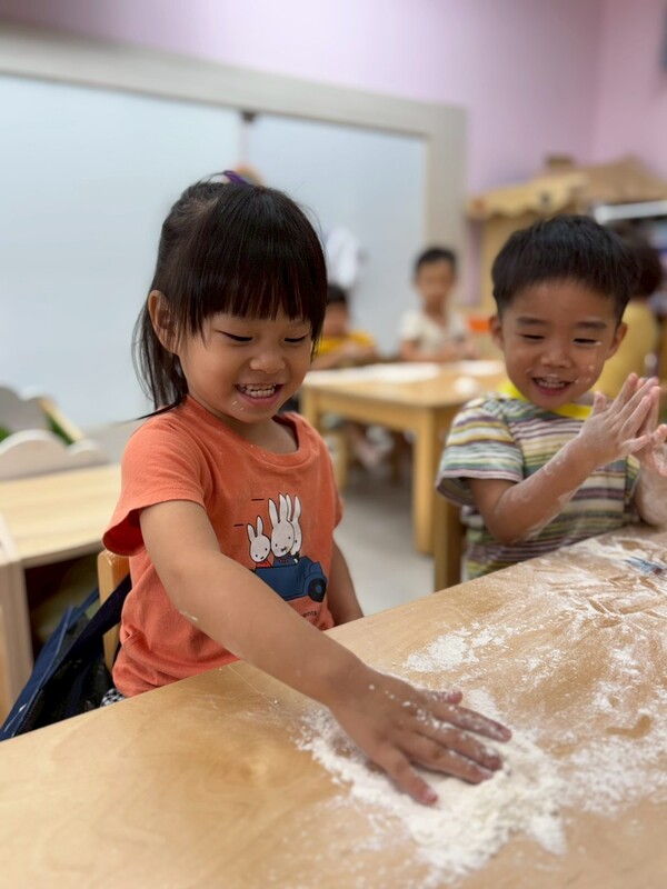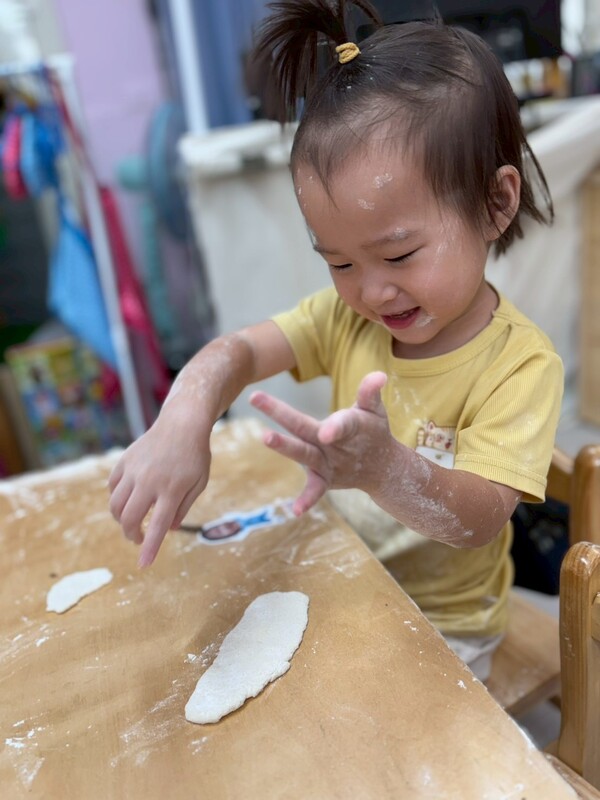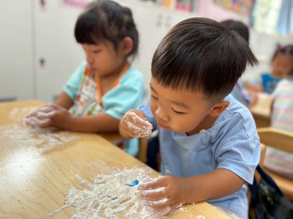 接著,孩子們用小手輕輕摸一摸,感受它細緻柔軟的質地。當孩子們將麵粉聚集起來時,興奮地說:「你看!變成山了!」隨著老師加入水,白白的麵粉慢慢地變成可以搓、可以揉的麵團!孩子們發出驚嘆聲,觸摸著麵團,驚喜地說:「摸起來黏黏的!」