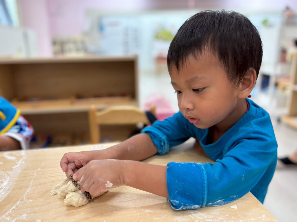 延續前幾次經驗,這次加入了孩子們熟悉的自然元素—小葉南洋杉,孩子們則稱他們為「毛毛蟲」,還有教室裡最愛的「積木」,讓孩子們自由探索、進行創作。有的孩子將小葉南洋杉插入麵團,開心的分享:「這個蛋糕要送給媽媽!」也有孩子透過積木進行蓋印,分享:「麵團上有好多圈圈。」