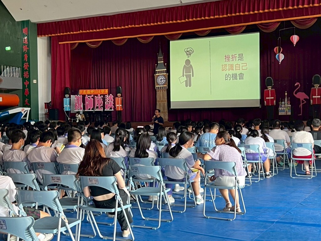 會考激勵講座第一場請到本校能文能武的最佳代言人之一~浩勳老師來跟孩子聊聊國三這一年的心態盡力與調整,以幽默風趣並結合學生們喜愛的卡通人物、電影劇情來說明國三這一年的心境起伏、挫折的意義與如何因應調整,期盼能給孩子們增加面對教育會考的能量,持續向前行!