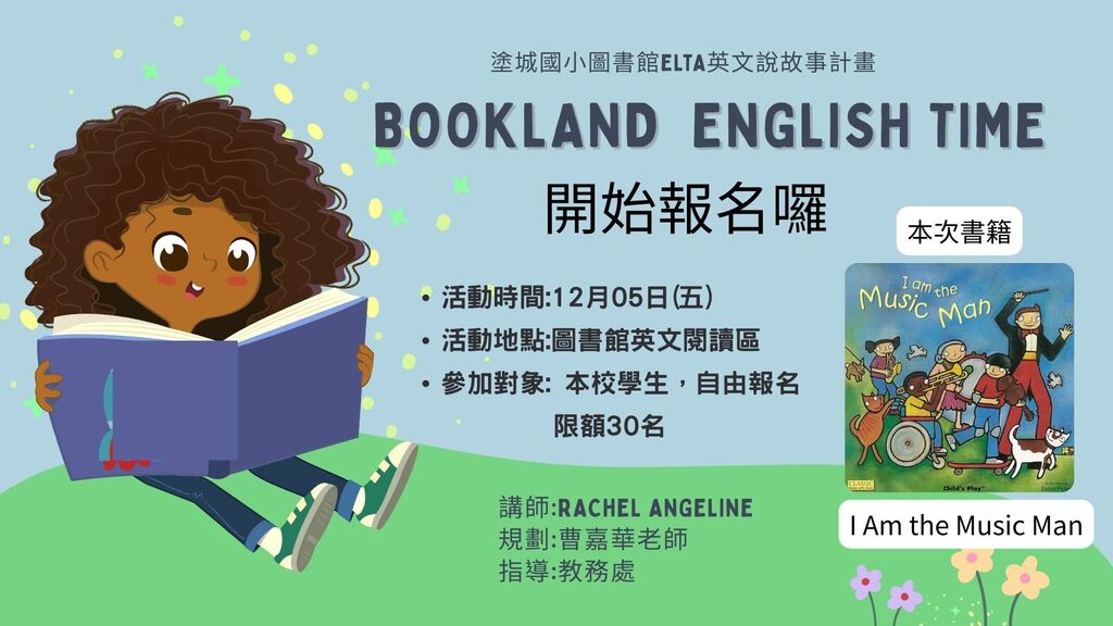 【塗城報導】塗城國小圖書館廣受好評的「ELTA英文說故事計畫——Bookland English Time」即將於12月5日(週五)再度登場!本次活動將在圖書館英文閱讀區舉行,邀請全校學生一同沉浸在英語與音樂交織的閱讀世界。