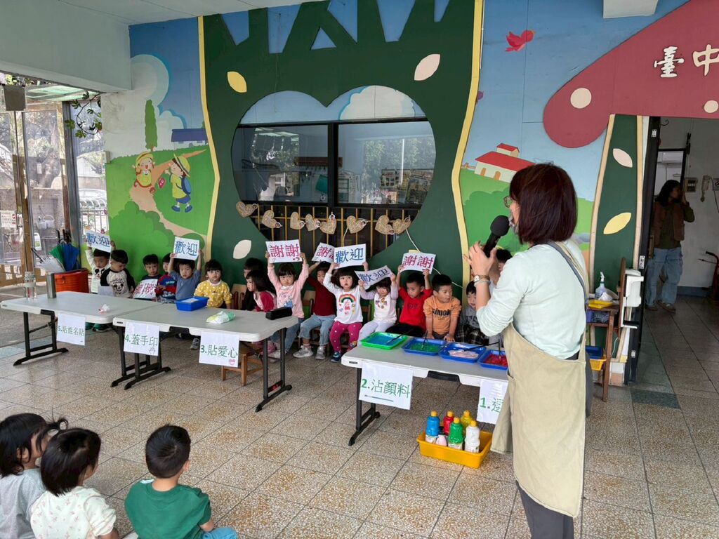 樹蛙班的聖誕樹計畫,是透過蓋印方式,蒐集全園師生的手掌印,讓每個手掌印成為聖誕樹上的樹葉,象徵彼此的心意相互匯聚。孩子們有了這個計畫後,便在校門口設置活動攤位,還親手製作說明牌與引導語,讓大家一看就知道活動內容。而當有師生路過時,他們也會開心地唱起「聽我說謝謝你」,用甜美動人的歌聲吸引大家停下腳步參與。