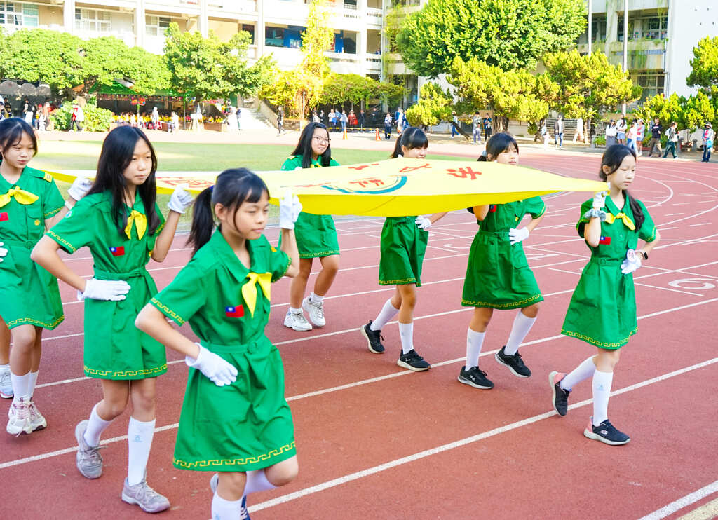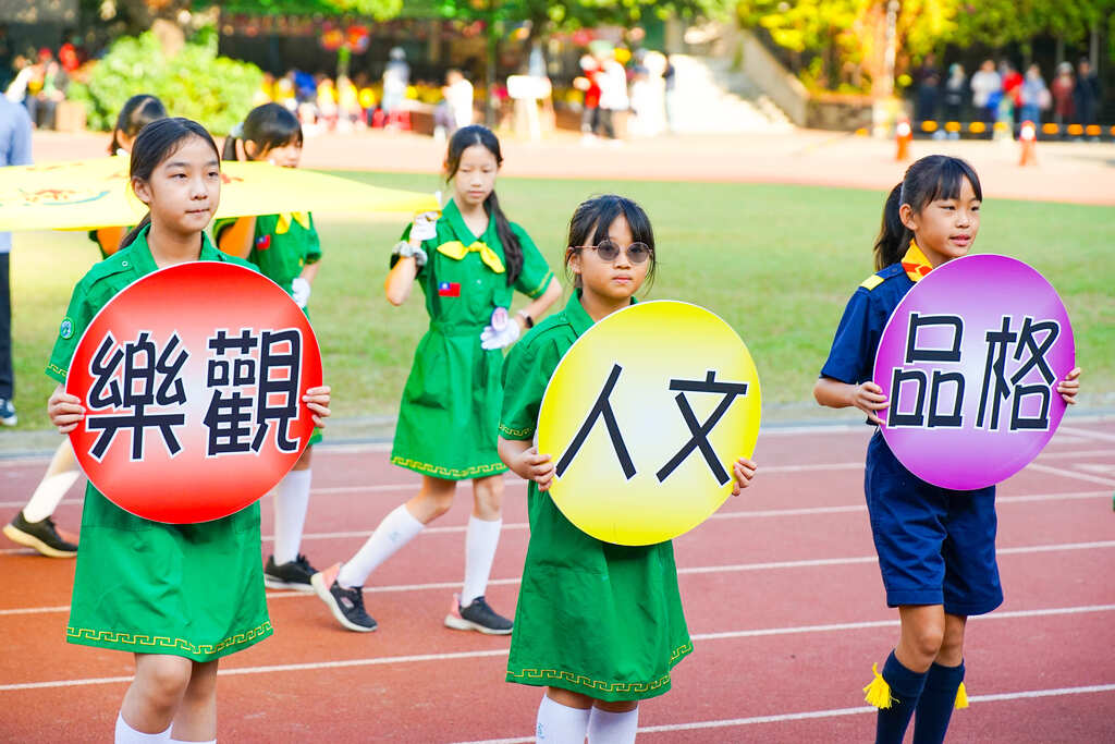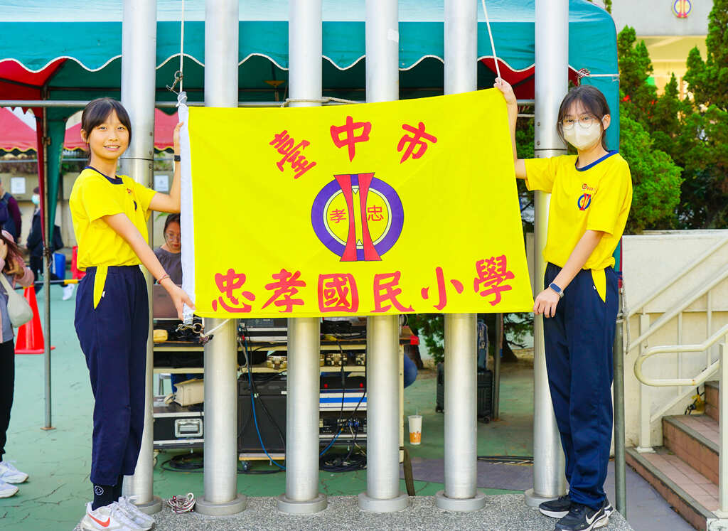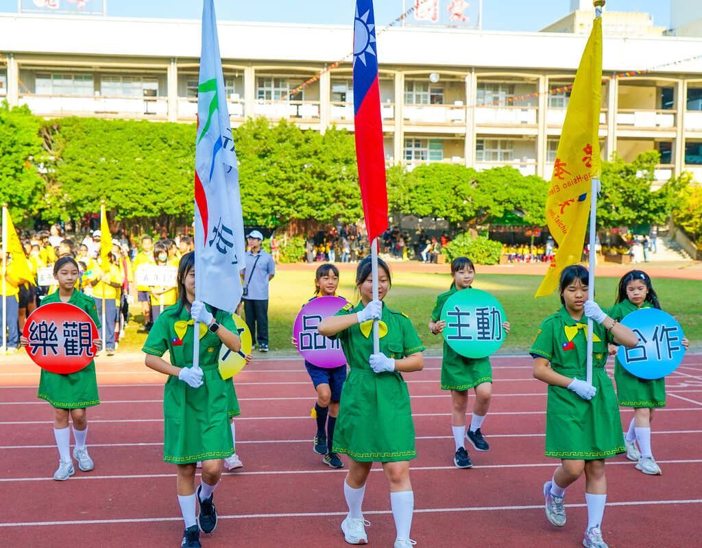 忠孝國小130週年校慶運動會,會旗進場。 由中華民國國旗、臺中市市旗及忠孝國小校旗所組成的旗隊。 在旗隊前方引導,是由五名幼童軍手持主動、人文、品格、樂觀、合作 ; 所呈現忠孝國小的辦校願景。 旗隊的孩子們正以整齊的步伐,神采奕奕的通過司令台前方,正代表忠孝師生氣勢如虹! 大會會旗由8位女童軍護旗,代表的是大會最崇高的精神象徵,會旗冉冉上升,迎風飄揚,在高空俯視著我們,告訴我們要發揮運動員的精神,展現最完美的演出。 #忠孝130