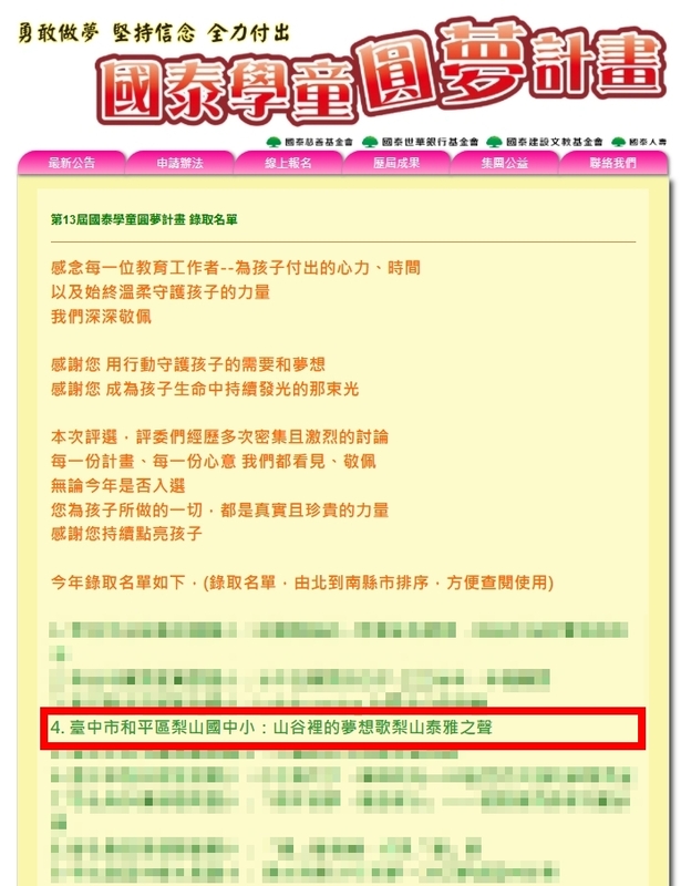 致親愛的國泰學童圓夢計畫團隊、一直支持我們的家長,以及所有關心梨山國中小合唱團的朋友們: