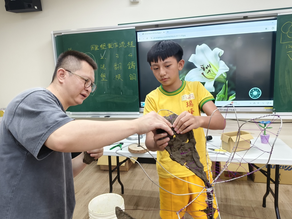 校友銅雕藝術家陳士雄先生再度返校協同教學,以童心未泯的創作理念引導學子,讓藝術成為生活的永恆。師生在共創過程中,將希望的種子撒入心田,期待有朝一日能如彩蝶般自在飛舞。
