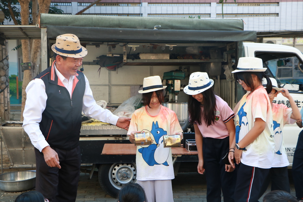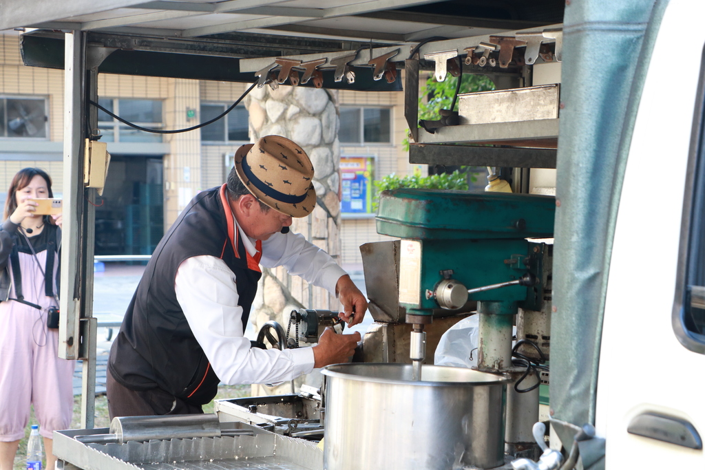 不同於常見的玉米爆米花,現場的米香機成為焦點。當師傅打開壓力鍋,「轟」的一聲巨響震撼全場,熱騰騰的米花瞬間湧出,散發出溫暖的稻米清香。同學們排隊領取剛出爐的米花,品嚐這份酥脆、天然又充滿古早風味的點心。