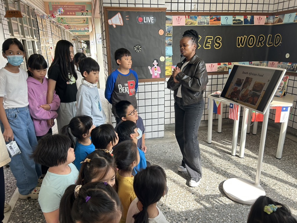 除此之外,主題書展期間結合本校外師 MBali 的文化探索活動,持續為孩子增添國際視野。活動首先登場的是「外師話家鄉」活動,來自南非的 MBali 以生動簡潔的介紹與圖片,帶領學生認識南非風土民情,並以輕鬆的問答活動提升孩子的英語表達力。外師也教大家說幾句簡單的當地語言,現場交流練習相當有趣,最後帶孩子們欣賞南非國歌,為活動劃下精彩的句點。