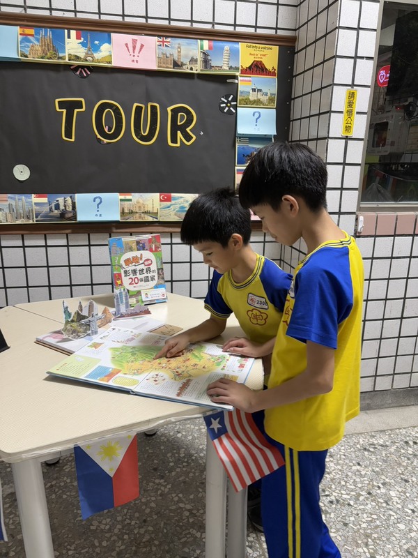 國光國小「世界好好玩 Give Me Five」校慶主題書展,除了在閱樂園現場展出之外,教務處也在川堂的鋼琴區加入創意布置,設置「世界大富翁」遊戲,孩子們在遊戲過程中認識世界各國地標、體驗各國景點的特色,經由「命運」與「機會」格子反覆練習,不僅增進雙語表達,也激發對世界文化的好奇心。