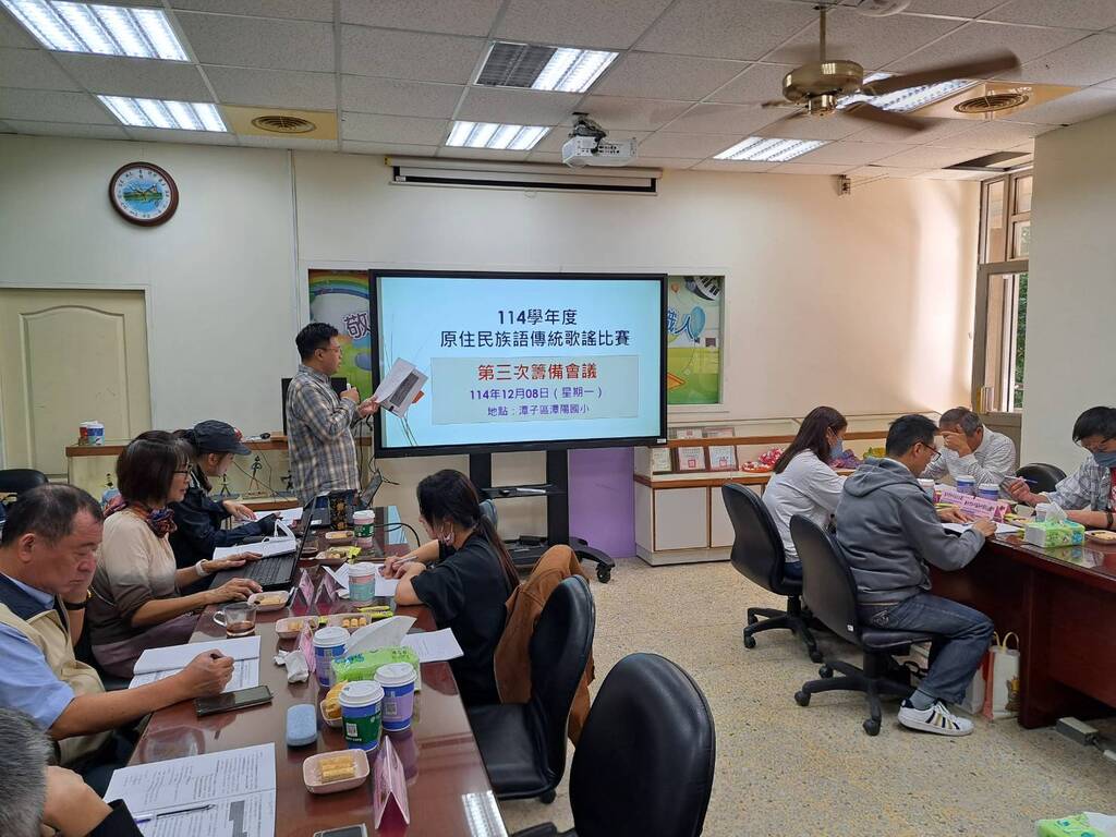 為迎接即將到來的 114 學年度原住民族語傳統歌謠比賽,籌備團隊於 12 月 8 日在承辦學校召開第三次籌備會議。教育局小教科股長、籌備學校行政團隊及多所協辦學校齊聚一堂,為活動的每一個細節仔細討論,展現教育界共同承擔文化傳承使命的決心。