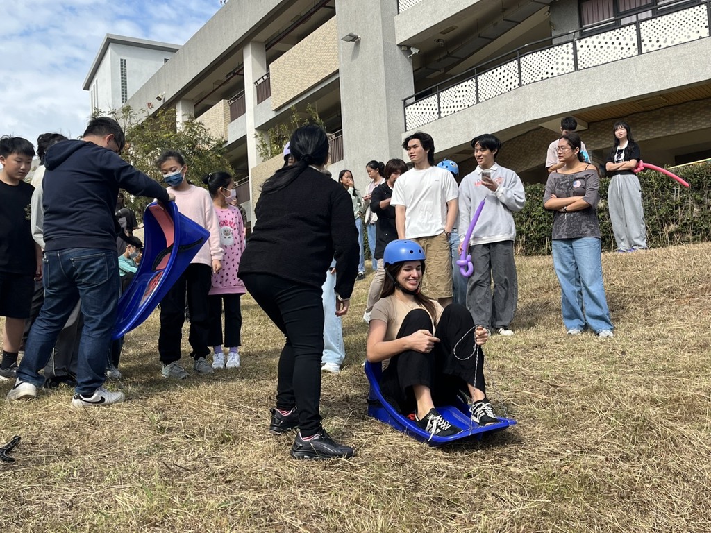 之後,大隊移動到東海國小最獨特的學習場域——台中唯一的滯洪池教室,展開驚喜連連的滑草體驗。許多大學伴首次嘗試滑草,一滑出去就驚呼「Wow!」笑聲、尖叫聲在大肚山間此起彼落。