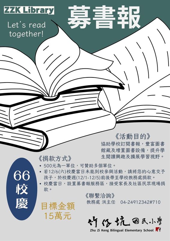 竹仔坑國小66週年校慶經典活動-募書報,在家長與社區朋友的支持下,成功達成 15 萬元的募集目標。為了呈現每一份捐贈所代表的祝福與愛心,學校特別將募集海報布置為「耶誕禮物主題」,象徵每位家長都像耶誕老公公一樣,將最美好的禮物帶給孩子-那是一份能陪伴一生的閱讀力量。