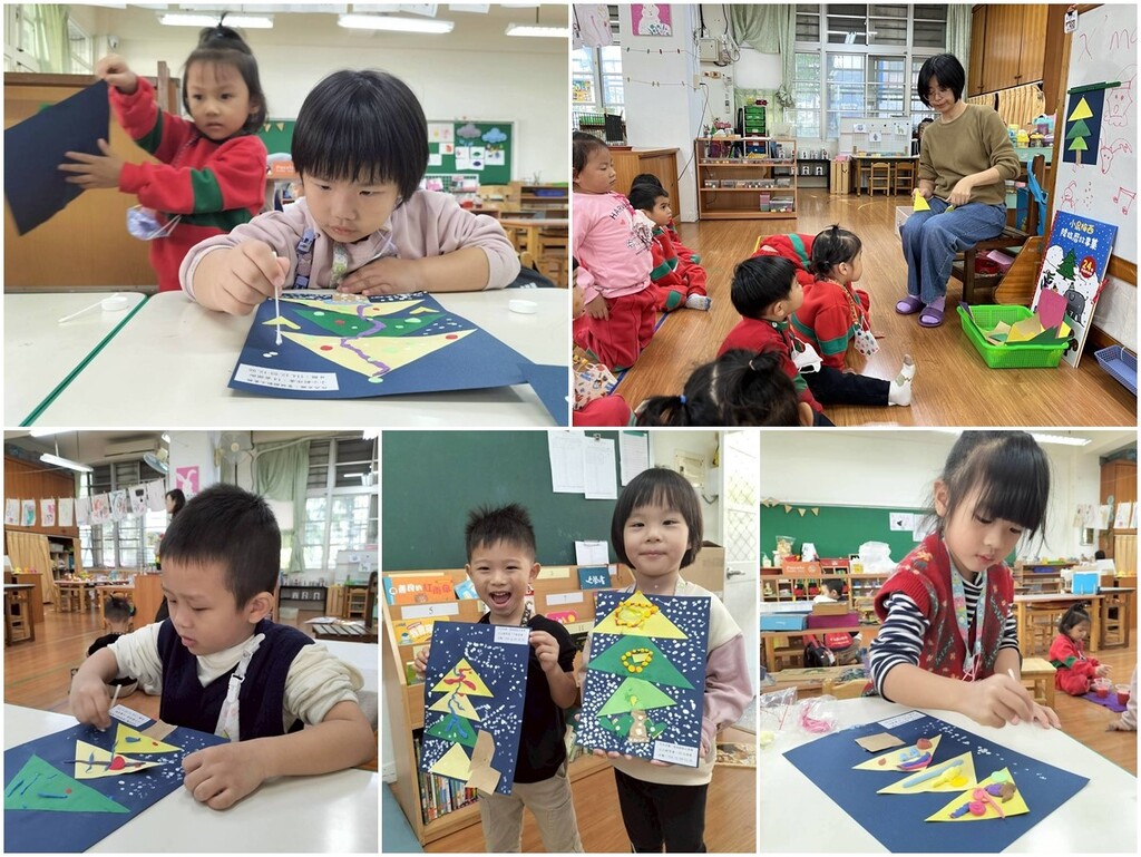 本週進行了黏土操作的練習,主要是引導孩子們將「黏土搓長」的技巧運用在實際創作中。活動一開始,孩子們利用大大小小的三角形的紙片,將它們組合拼貼成聖誕樹的外型,在排列與拼放的過程中,孩子也練習到空間概念與版面配置。接著,孩子們要把粘土搓成一條細長的粘土條,專心地繞在聖誕樹上,成為亮眼又豐富層次感的裝飾繩。許多孩子在繞黏土的時候特別細心,會觀察哪裡再補一段、哪裡貼緊一些需要的地方,表現出了相當好的手部控制。最後,再用棉棒沾取白色顏料,在樹上輕點出一朵朵小雪花,為作品增添冬日氣氛。