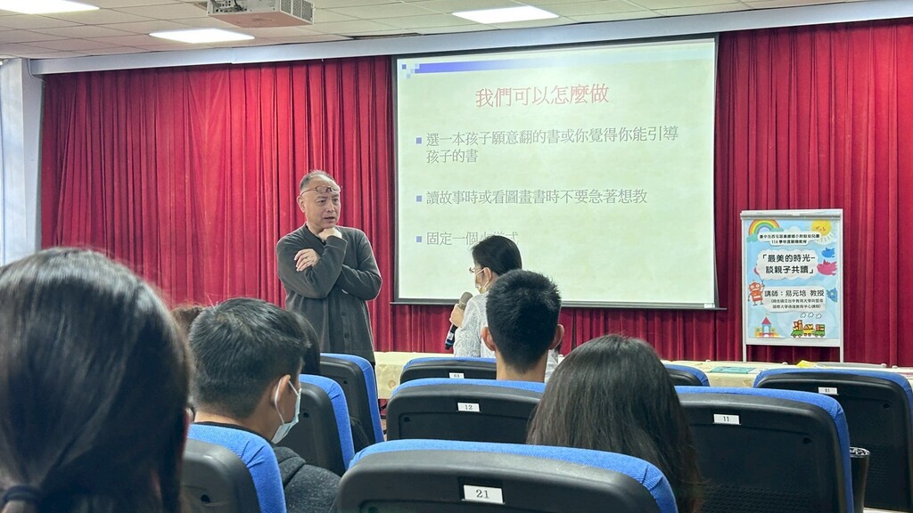 家庭教育是孩子成長最重要的基礎,114年12月13日重慶國小附幼舉辦親職教育講座『最美的時光—談親子共讀』,邀請國立臺中教育大學、暨南國際大學通識中心講師—易元培教授擔任講師,透過講座了解親子共讀所產出的情感連繫。學習如何為孩子選擇適合的繪本、如何與孩子進行共讀、如何讓孩子愛上閱讀,並享受最美的時光~親子一起共讀樂。