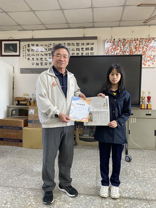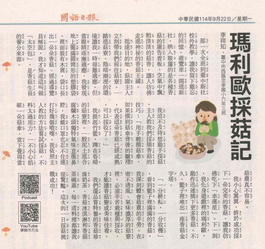 忠孝國小再傳佳音!本校六年三班李祥知同學,作品刊登於《國語日報》,榮獲「國語日報小作家證書」,展現優異的語文表達與觀察力。李同學曾於學校戶外教育活動中,前往新社進行「瑪利歐採菇記」體驗,將田園風光、採菇過程與同學互動的趣味見聞,化為生動文字,內容真實有感,深受肯定。 張耀中校長特別親自頒發證書,肯定其在閱讀與寫作上的投入與成長,也勉勵同學善用生活經驗,將學習轉化為創作能量。感謝師長指導與家長支持,讓孩子在走讀學習中寫出精彩篇章。