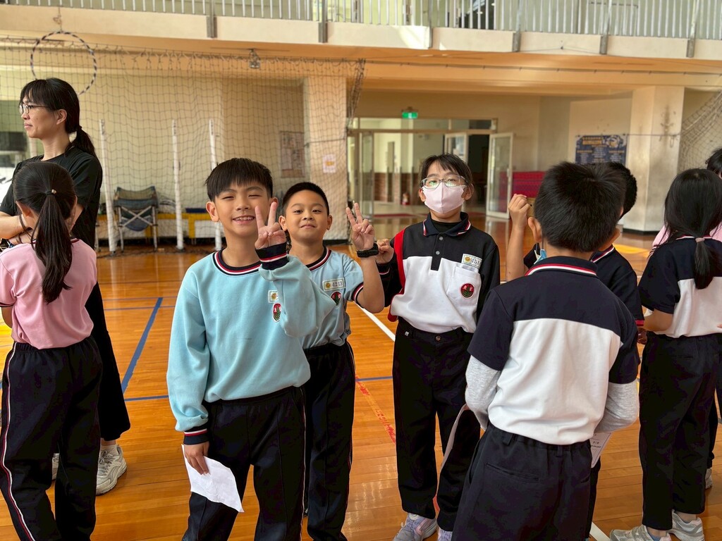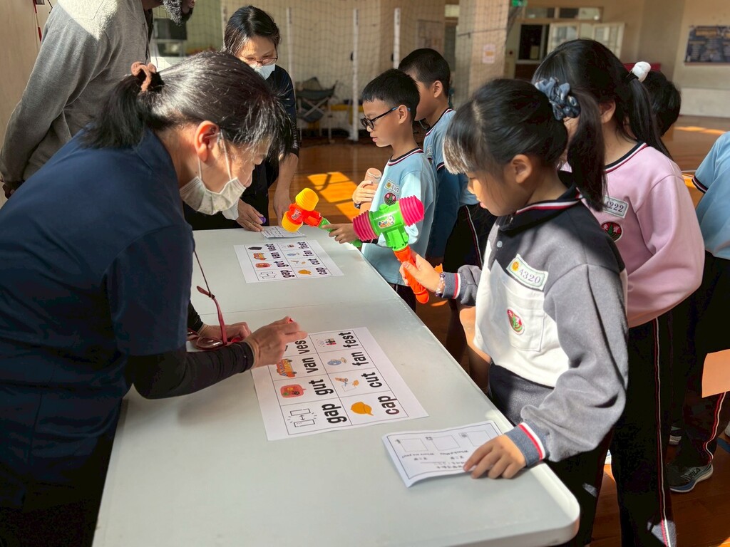 闖關現場熱鬧非凡,內容設計精巧:不僅讓學生練習辨識日常用品;也考驗學生對生活地點的認識。學生們穿梭於各關卡間,流暢地用英語回答關主提問,展現十足的自信。當成功過關拿到精美小禮物時,孩子們臉上洋溢著興奮與滿足的笑容,紛紛開心地互相展示戰利品,現場氣氛沸騰。