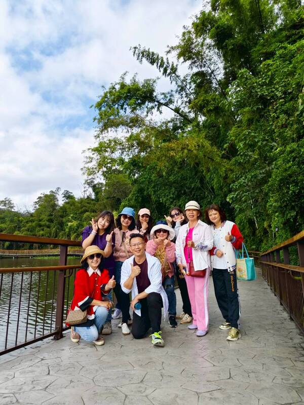 旅行的首站,志工們來到以湖光山色聞名的峨眉湖。平靜的湖面,倒映著藍天白雲與翠綠山巒,營造出溫柔寧靜的氛圍。志工們在湖畔微風中愜意散步、閒聊,臉上的笑容與湖面反射的光芒相映成趣。