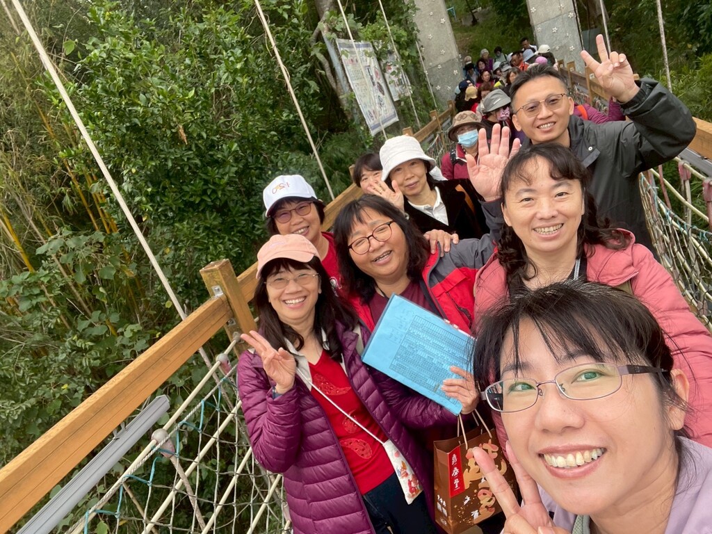 隨後,一行人踏上細茅埔吊橋。這座橫跨水面的吊橋,雖然微微搖晃,卻增添了旅程的趣味性。夥伴們互相扶持、彼此提醒,並在橋上留下許多歡快的合影。有志工分享:「走在吊橋上,大家相互照應的感覺,就像我們在學校裡共同守護孩子一樣,充滿了力量和溫暖。」這段路程,不僅是親近自然,更是志工夥伴間情感的連結與鞏固。