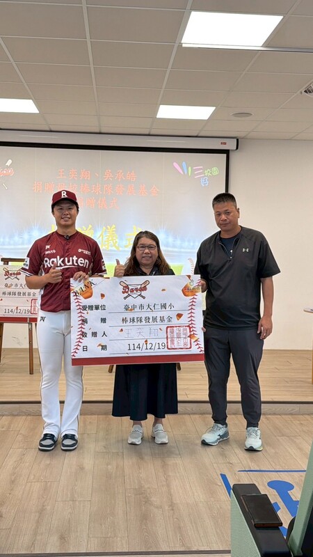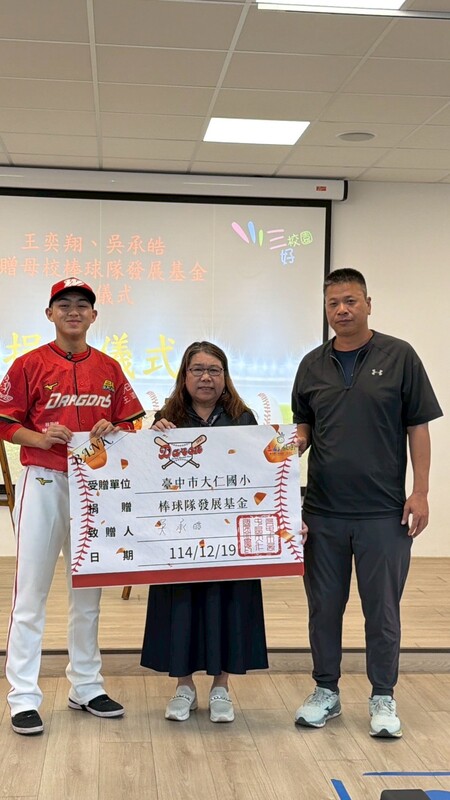 在陽光灑落的棒球場上,熟悉的紅土氣味與揮棒聲,大仁國小迎回兩位特別的身影。本校第一屆體育班畢業生王奕翔、吳承皓,成功加盟職業棒球-「樂天桃猿」、「味全龍」後,特別回到母校,捐贈棒球隊發展基金,以實際行動回饋孕育夢想的起點,也為正在努力追夢的學弟們送上最真誠的鼓勵。