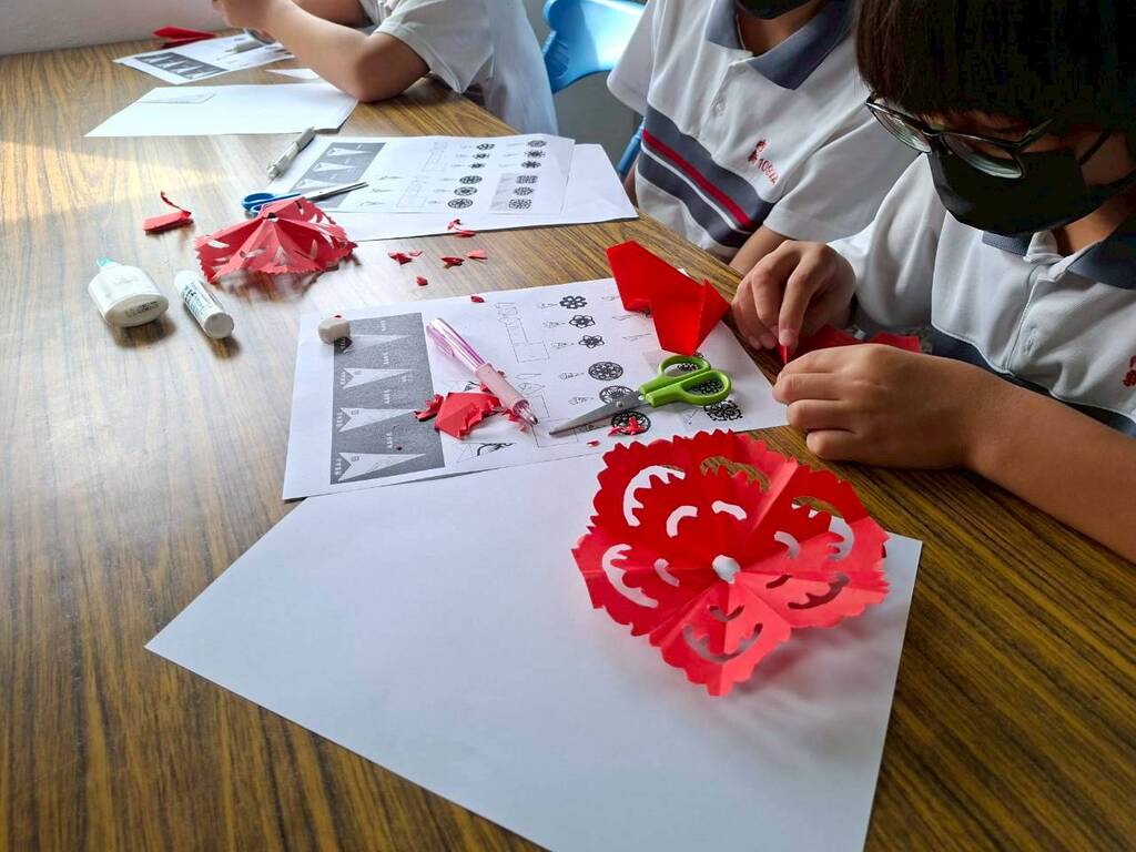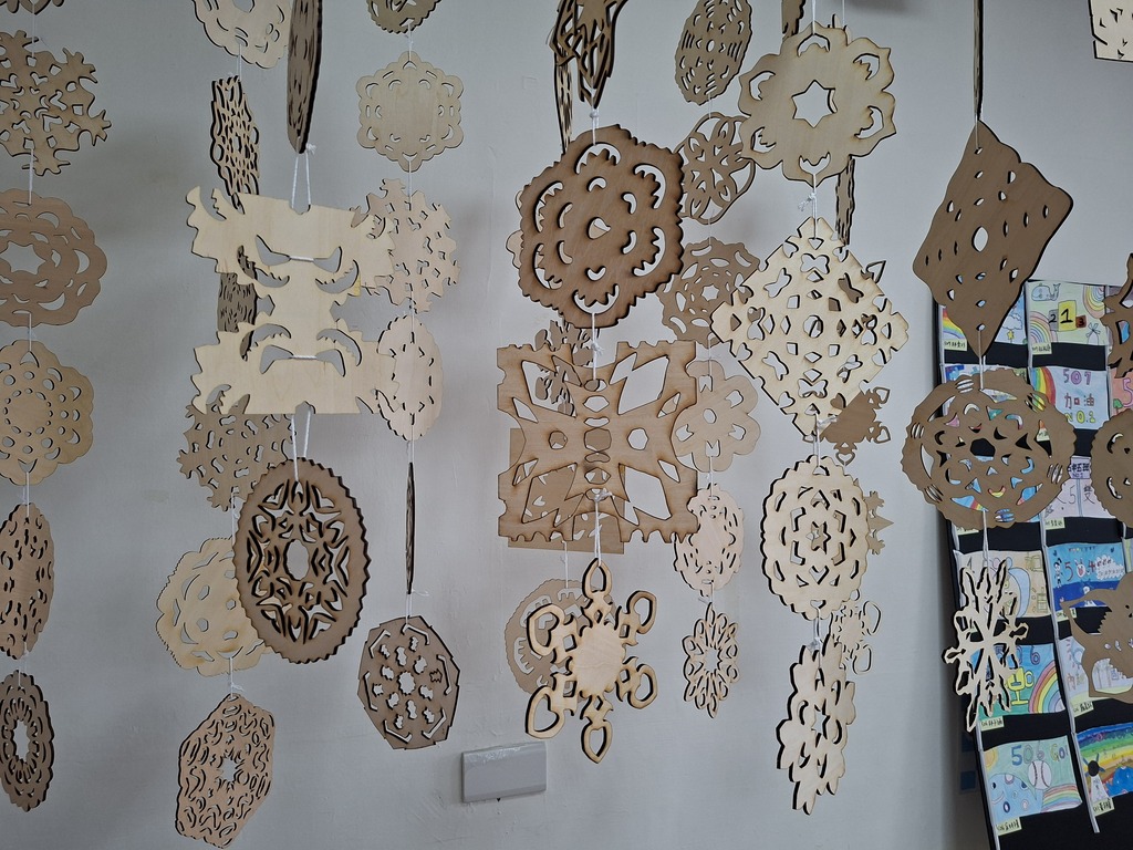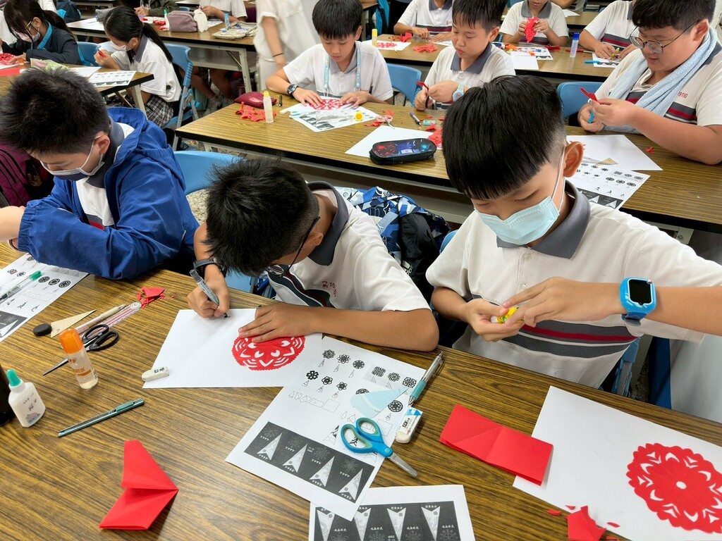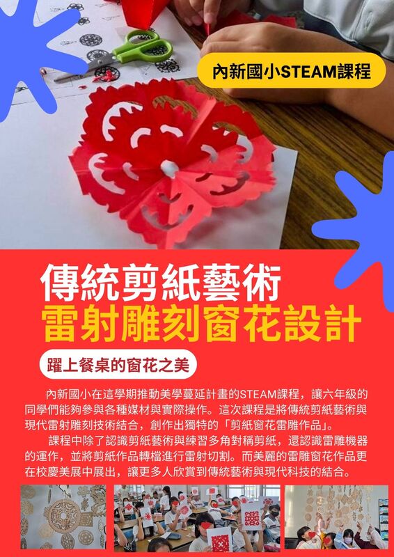 內新國小在這學期推動美學蔓延計畫的STEAM課程,讓六年級的同學們能夠參與各種媒材與實際操作。這次課程是將傳統剪紙藝術與現代雷射雕刻技術結合,創作出獨特的「剪紙窗花雷雕作品」。 課程中除了認識剪紙藝術與練習多角對稱剪紙,還認識雷雕機器的運作,並將剪紙作品轉檔進行雷射切割,變成可以放置在餐桌上的藝術鍋墊。而美麗的雷雕窗花作品更在校慶美展中展出,讓更多人欣賞到傳統藝術與現代科技的結合之美。