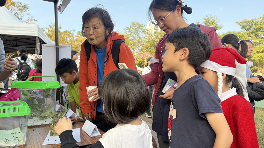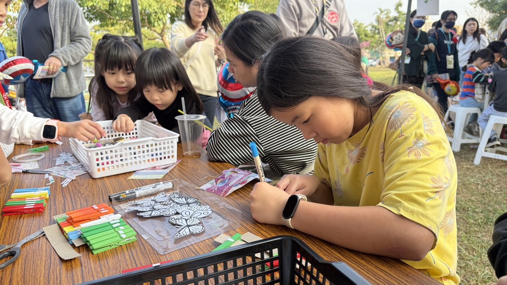 本次活動闖關現場,學生們擺脫課本束縛,自信地向市民解說蝴蝶的生態習性。最吸睛的莫過於「現場觀察區」,孩子們細心引導民眾觀察,將平時在校園蝴蝶園觀察到的專業知識,轉化為親切易懂的語言。此外,攤位更結合「手作體驗」,讓參與民眾在互動中體會生物多樣性的美感。
