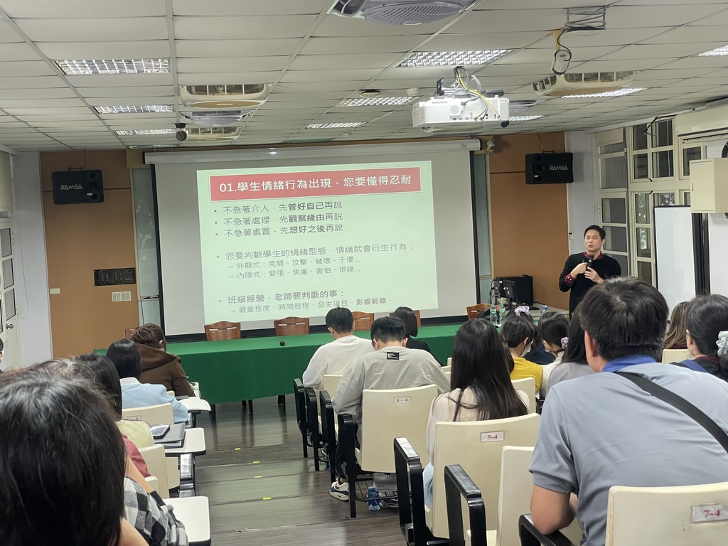 輔導室辦理教師特教知能研習,邀請蘇文清職能治療師分享學校老師如果遇到學生出現情緒行為問題,建議不急著處理、妥協與合理化問題,先控制自己的情緒,勇於面對學生的行為,冷靜思考當下可行策略應用。
