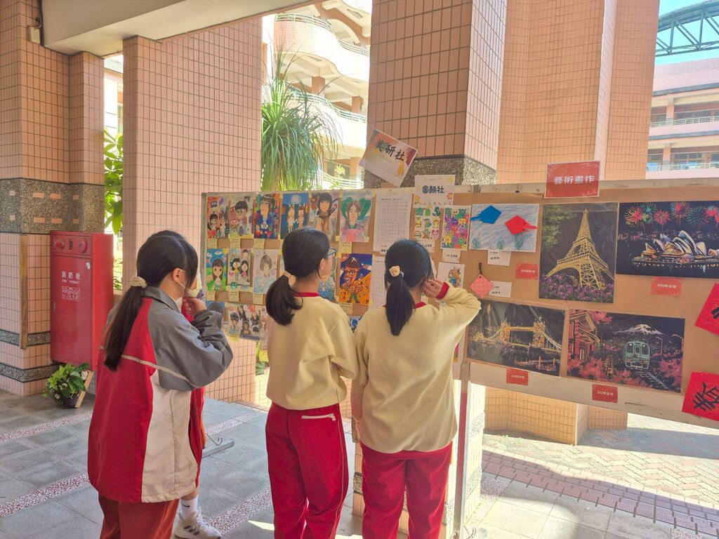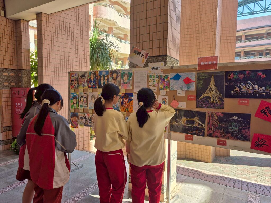 此外,森友社以「耶誕裝飾」打造節慶氛圍,吸引不少同學駐足拍照;美研社與圖研社共同呈現的「藝術創作」作品風格多樣,從素描、水彩到創意設計,充分展現學生的美感素養與創作能量,獲得師生一致好評。