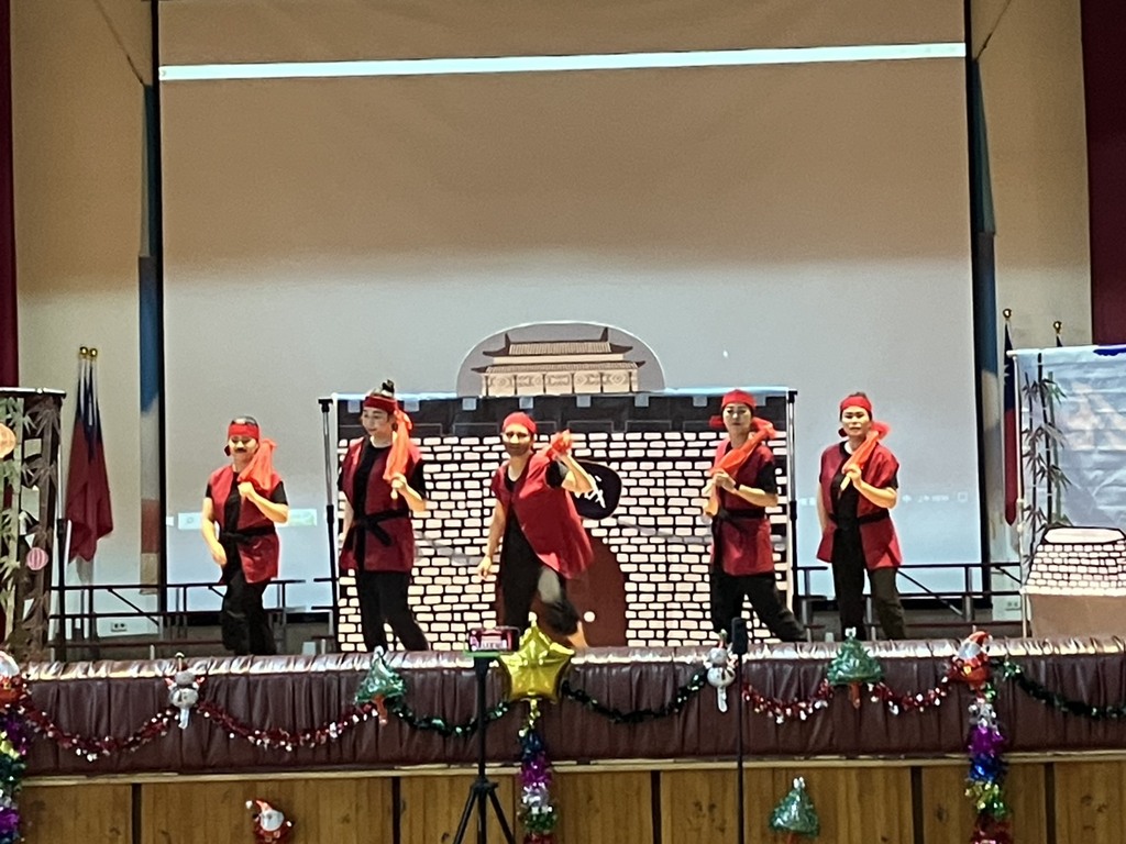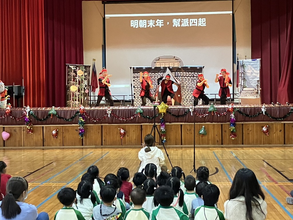 「感謝彩虹愛家協會帶來聖誕音樂劇 最好的師傅…」校長致詞感謝表演團隊。 今年的聖誕劇劇情以激發學生潛能、引導學生自信與學習,成為他人的助力。故事是發生在中國古代「白羊城」,惡名昭彰的赤蛇派,準備進攻白羊城,害怕的百姓,不知該如何是好?此時…傳說中的功夫大師──黃師傅出現了!黃師傅收了幾個不起眼的小人物為徒,但是,這些人在短短一個月能學會「白鶴九式」嗎?讓我們一起來欣賞…