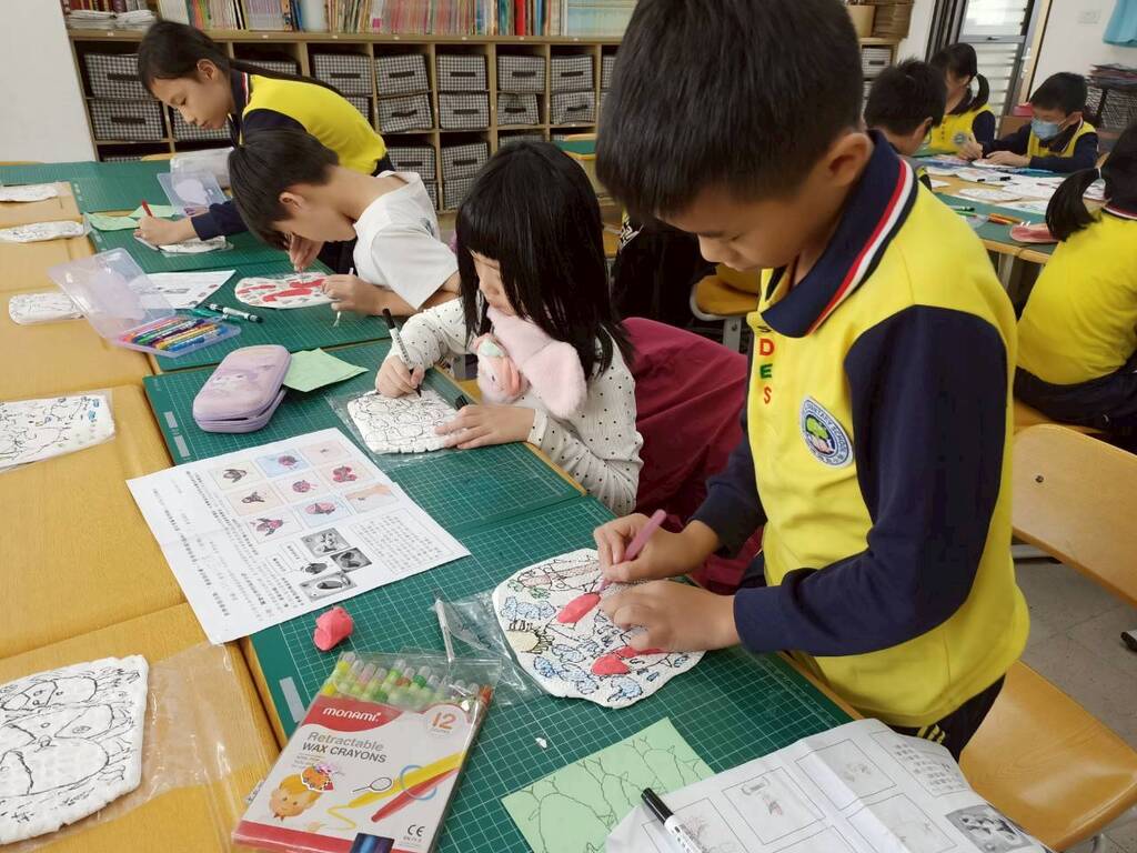 除了生態議題,學生也向「超級探險家」劉爺爺學習。在「原住民圖騰」展區,學生利用珍珠板進行版畫創作,透過滾輪與馬連壓版,親手刻劃台灣原民文化的線條。