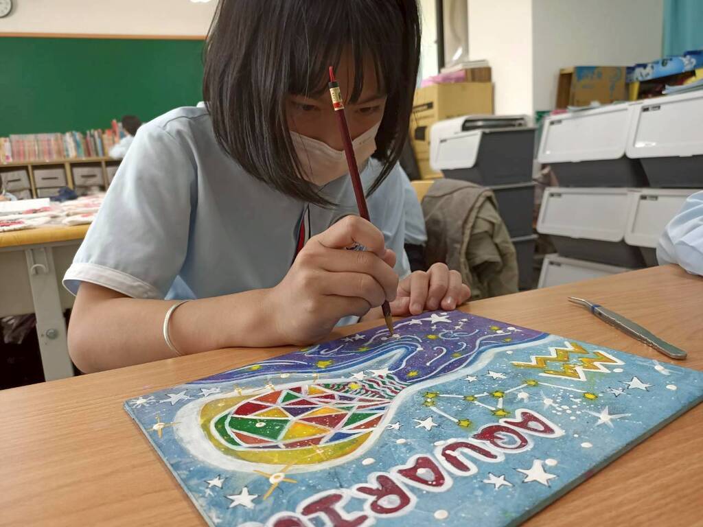 在「熱情創新的藝術頑童」展區中,四年級課照班學生則挑戰了難度較高的「12星座」膠彩畫。他們利用嬰兒油與墨汁在水面製造漩渦紋路(浮水染),並在畫板上層層堆疊礦物顏料,最後灑上白色顏料模擬繁星,營造出星光閃爍的深邃夜空。