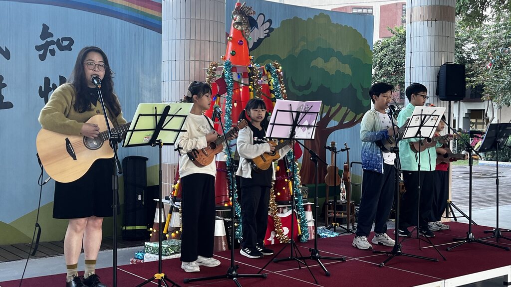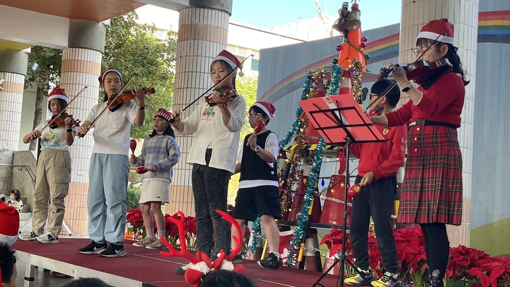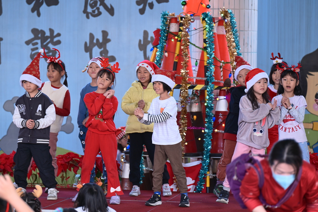 課間時刻,各年級學生輪番現身,將平日學習的成果化為最真誠的聖誕祝福。一年級課照班用童真的歌聲唱出《Santa Claus Is Comin’ to Town》;小提琴社團拉出《一閃一閃亮晶晶》與《聖誕鈴聲》的旋律;二年級課照班輕快地演唱《Underneath the Tree》;直笛團則以氣勢十足的《比才鬥牛士進行曲》展現自信與默契。高年級學生合唱《小白花》與《Jingle Bells》。最後,全場齊聲唱起《Jingle Bell Rock》,歡笑與掌聲此起彼落,為活動畫下最溫馨的句點。