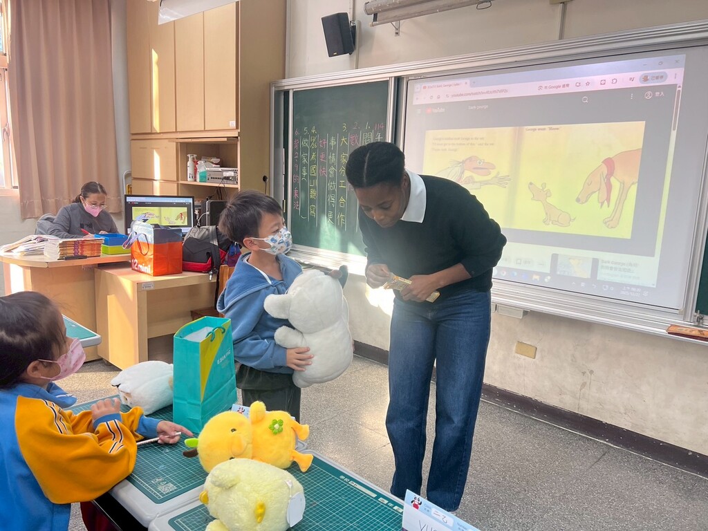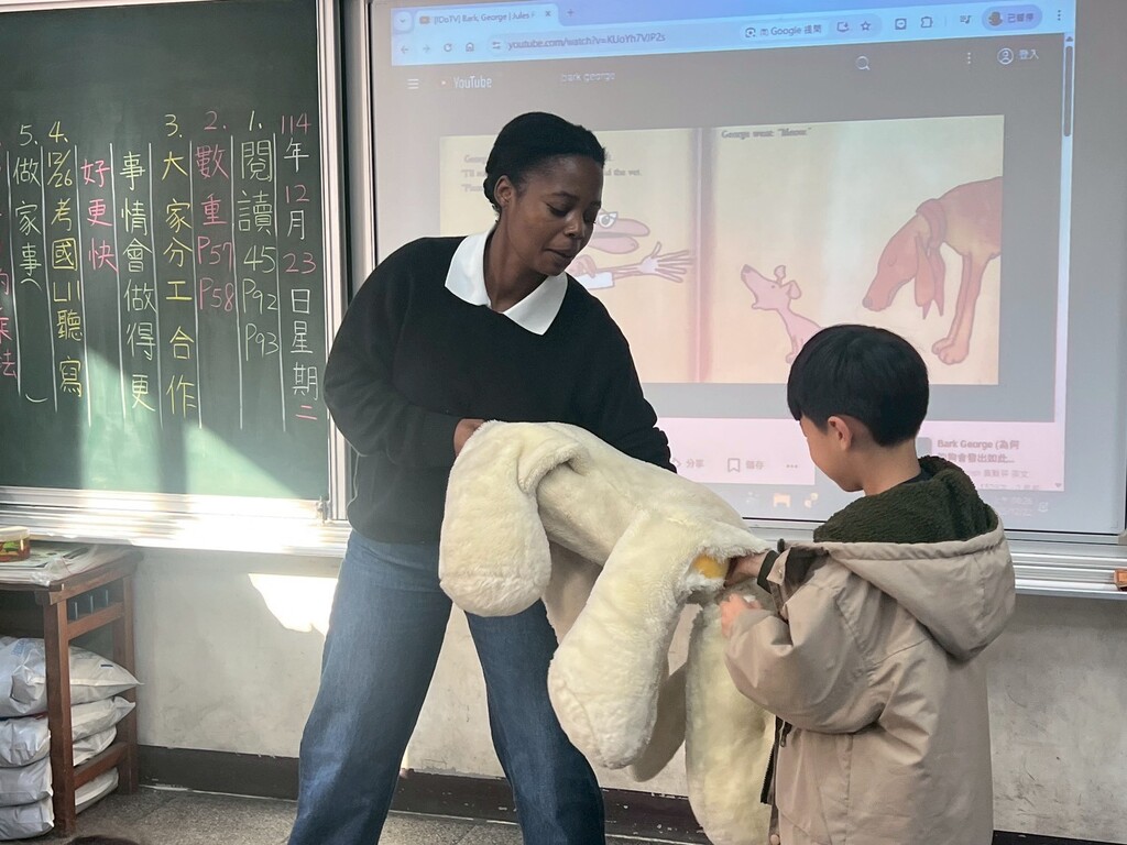 潭子新興國小晨光時間,外師 Sofia 帶領學生進入《Bark, George》的奇幻世界