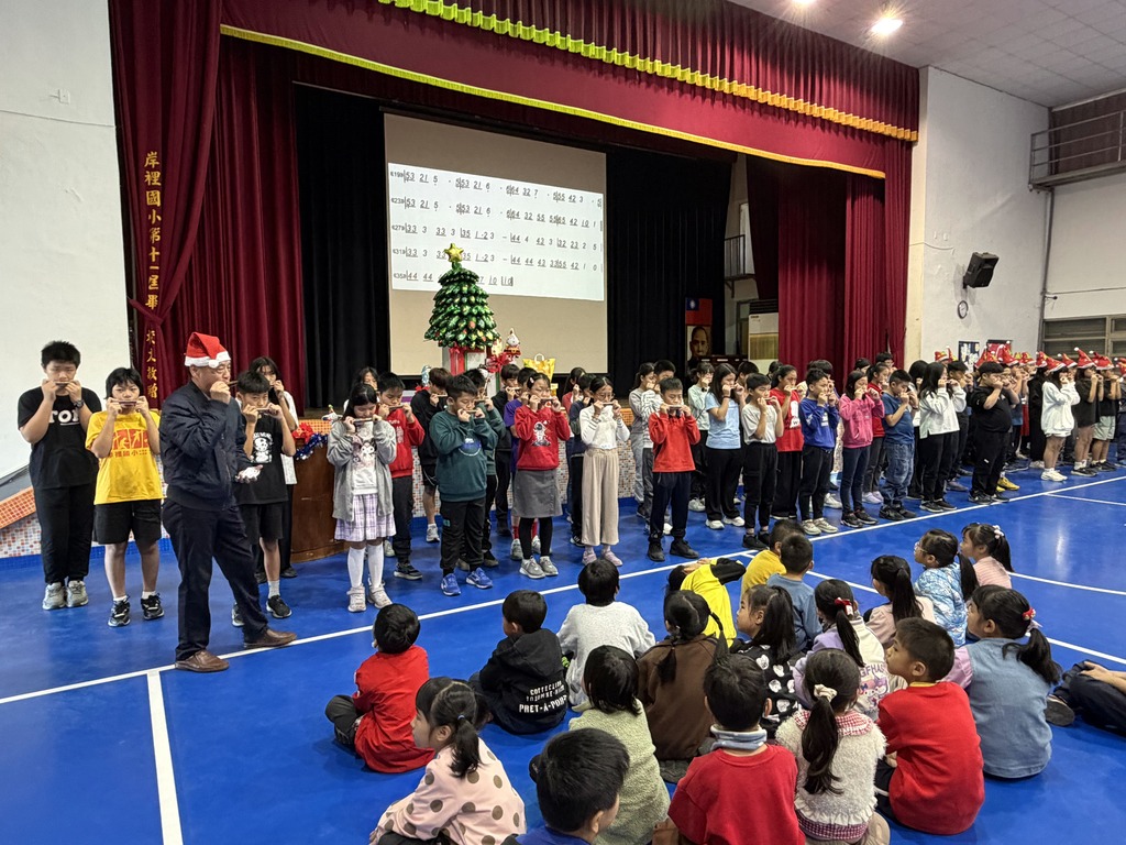 除了溫馨的感恩任務,這次活動也邀請了外師Leon和輔導室的老師一同雙語主持,以 “Let’s welcome the 4th ,5th,6thgraders and also the principal.”的語句鄭重地介紹出今天的表演者外,更透過了詼諧的「阿嬤摸你腳(閩南語)」點出Harmonica Performance(口琴表演),也意外發現岸裡小朋友臥虎藏龍,竟然有人能夠聽懂外師的英語主持內容並成功擔任今日活動的翻譯機。就這樣一曲Jingle Bells在雅麗老師環繞式的記錄下重覆在岸裡的Facebook上撥放著,記錄下孩子們學習成果的同時,也展現出他們上台表演的風範。