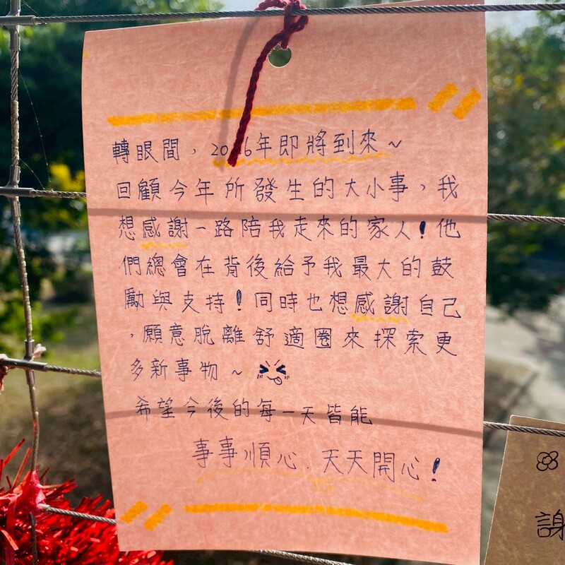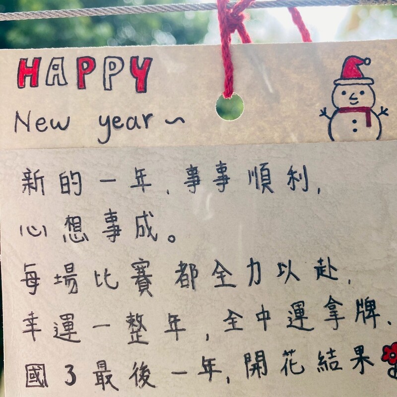 1月2日(五),是2026年第一個上課日。 大里高中感恩樓二樓川堂也悄悄換上了新的風景——一張張由孩子們親手寫下、畫下的祈願卡,隨風輕輕擺動。 卡片上,有對家人與朋友的祝福,有對師長與校園的感恩,也有對新一年的小小期許;更有充滿童心與想像力的塗鴨,訴說著藏在心裡的故事與夢想。 這些純真的文字與色彩,讓校園在新年的起點充滿溫度與希望,也提醒著我們:每一天的學習與成長,都是在被祝福與愛所包圍中前行。