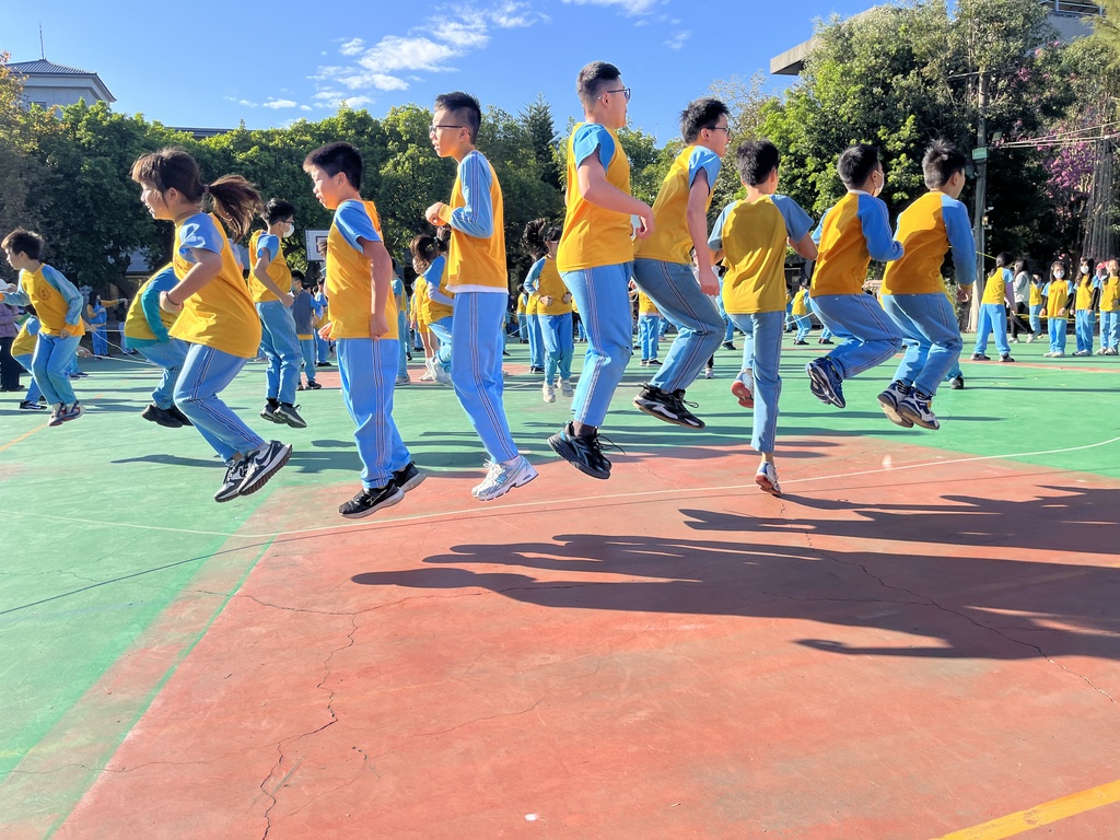 緊接著登場的是整場活動的重頭戲——「大跳繩團體賽」。這項活動不僅考驗參賽者的體力,更挑戰班級成員間的團結合作精神。 在搖繩手穩定的節奏帶動下,班級成員排成一列,依序或集體躍進繩圈。過程中偶有失誤,但同儕間的相互鼓勵,取代了責備,充分實踐了「勝不驕、敗不餒」的體育精神。
