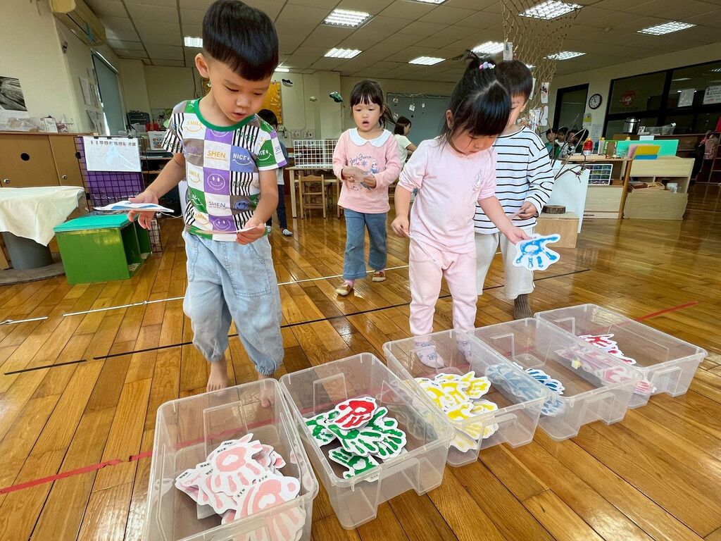 首先,樹蛙班要打造一棵愛的聖誕樹,孩子們在校門口設置攤位,邀請師生留下手掌印,大家挑選喜歡的顏色,在手心放上一顆小愛心,親手蓋在畫紙上,每一個掌印都是一片樹葉,象徵著彼此心意的匯聚,過程中,樹蛙班寶貝化身小老師,協助塗顏料、蓋手印與洗手,展現成熟的一面,笑聲與《聽我說謝謝你》的歌聲在校園回盪。收集近400張掌印後,老師與孩子們討論,確定要做漸層色的聖誕樹,開始分類、黏貼與裝飾,有人專心排列,有人細心黏貼金蔥,還有人指著自己的掌印興奮地說:「這是我的!」雖然製作程序繁複,但孩子們展現耐心與合作,當樹形漸漸成形,孩子們的眼神閃耀著自豪與喜悅!最後,一棵充滿愛與祝福的聖誕樹誕生,孩子們圍著大樹拍手歡呼充滿幸福氛圍。