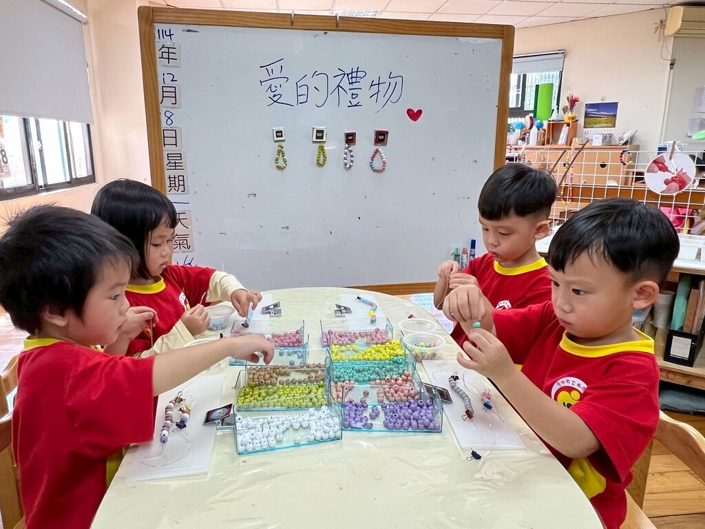 這次聖誕節,孩子們不再只是收禮者,而是親手為家人製作禮物,老師觀察到大家喜歡串珠,於是引導孩子設計獨一無二的手鍊。宜宸說:「我要做兩條手鍊給爸爸媽媽,因為他們照顧我。」博涵挑戰自我:「雖然有點難,但我想串好,我可以!」詠芯笑著說:「我要抱抱爸爸媽媽,送他們我做的手鍊。」每一顆珠子都承載著孩子的心意與感謝,在專注與耐心中,他們不僅提升了手眼協調,更在心中播下感恩的種子。