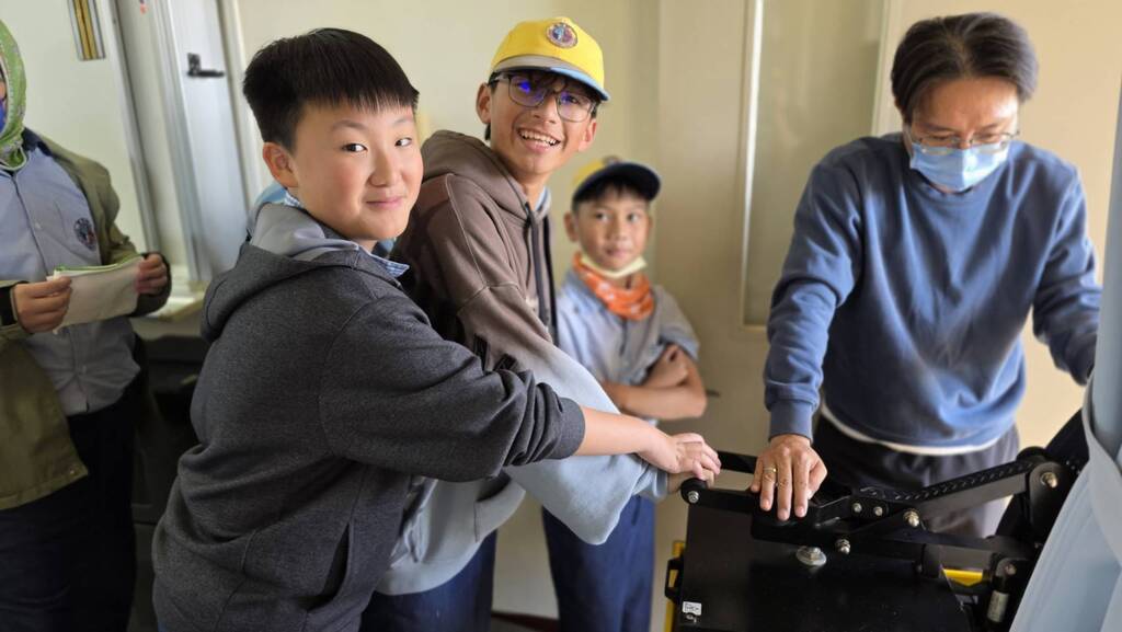 此外,課程中特別安排「熱轉印體驗」,臺日學生親手設計圖案,透過熱轉印機製作象徵臺日友好的專屬筆袋。當作品完成的那一刻,孩子們臉上滿是驚喜與成就感。透過營養午餐與課室體驗,日本學生不只走進臺灣校園,更在生活與學習中,留下真實而溫暖的交流回憶。