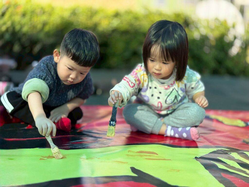 南屯幼兒園以食農課程作為核心本位之一,而其中最為人知、也延續多年的傳統活動,便是每年過年的圍爐活動。全園各班都會採收這學期細心照顧的作物,並一同為年菜佳餚做準備。除了飲食活動外,新年的環境佈置也從未停歇。延續去年十三條、長達十尺春聯所營造的壯觀氛圍,今年配合即將到來的馬年,特別繪製了一幅長達二十尺的巨幅畫作「十四駿迎春」。這幅作品近日即將懸掛於校園建築的大牆上,展現雷霆萬鈞、一馬當先的磅礴氣勢。