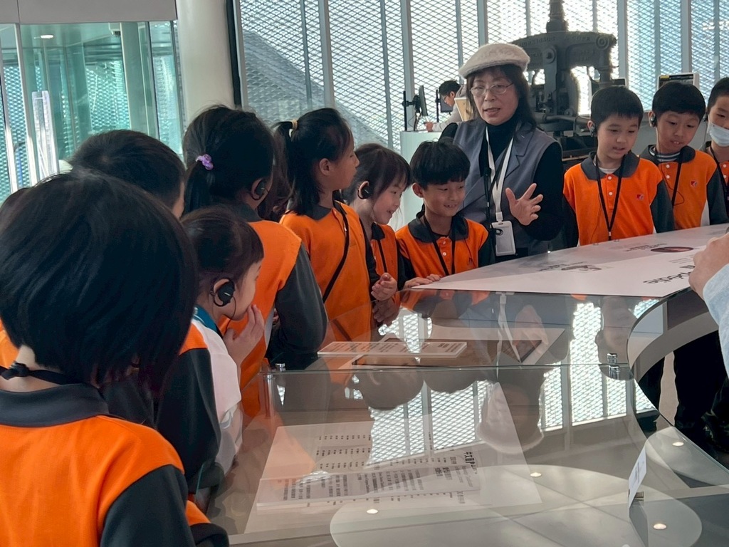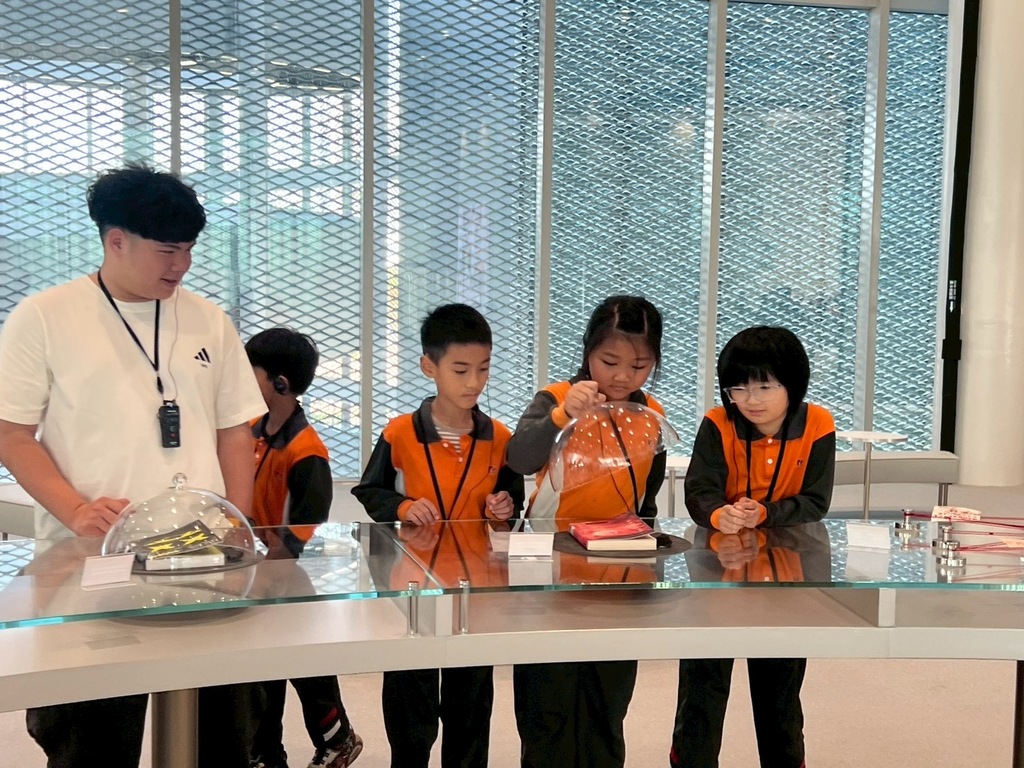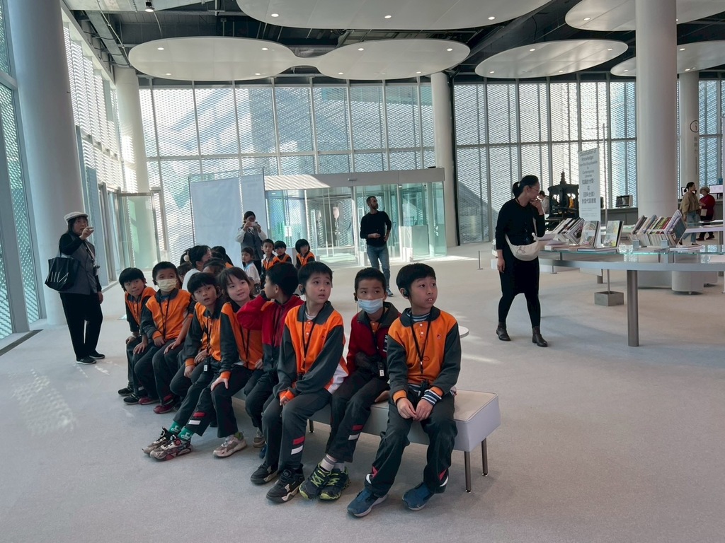 師生首先來到遮蔭廣場與挑高10公尺的圖書館大廳,寬敞明亮的空間讓孩子們發出驚嘆聲。志工介紹自然採光、通風與綠建築概念,孩子們發現:「綠美圖不用開很多燈也很亮,感覺很環保。」學生在實際體驗中,將永續理念與生活經驗相互連結。