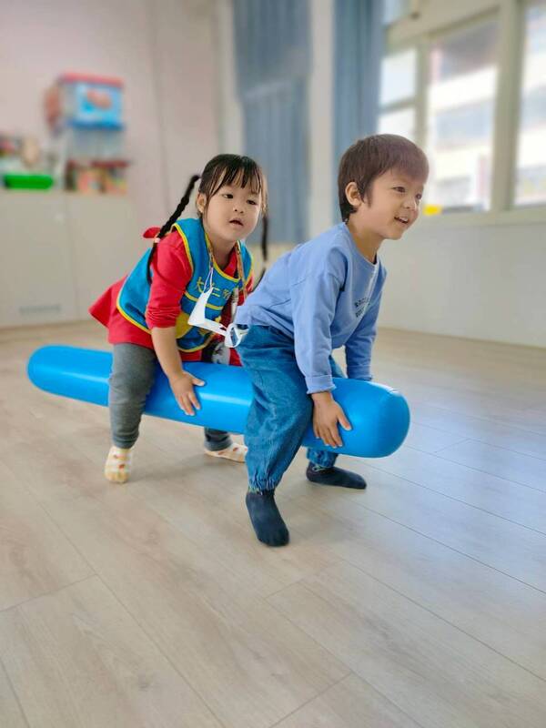 此外,在大肌肉活動時,結合今年的生肖年-馬,運用空氣棒進行『小馬爬爬』、『跳跳馬』、『騎馬趣』的遊戲,促進孩子身體的穩定與平衡,也促進孩子的合作力呢!