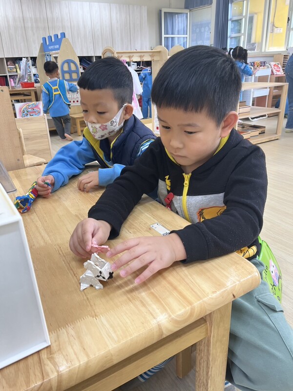 孩子們也有將色紙對折、黏貼,並利用毛根串起,製作出一串串可愛的鞭炮,不僅促進手眼協調與精細動作發展,也培養專注力與耐心。有孩子串完後,自信地說:「你看,鞭炮長長的!」