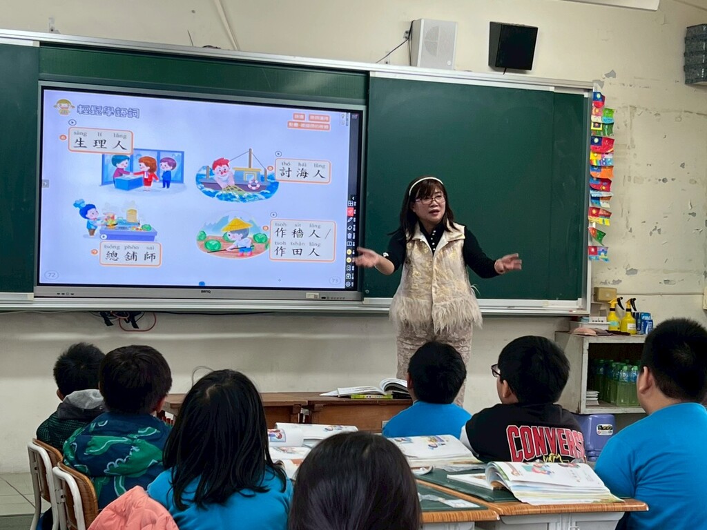 本次課程主題「咱的英雄」,旨在引導學生認識各行各業的本土語詞彙及其應用。蔡淑芬校長在課程設計中極具巧思,不僅僅是詞彙的講授,更強調結合學生的生活經驗。她引導學生從身邊的家人、社區人物出發,讓孩子們理解到,每一位在工作崗位上兢兢業業的人,都是守護我們生活的「英雄」。這種連結生活情境的導入方式,成功引起學生的強烈共鳴,讓語言學習不再是枯燥的背誦,而是有溫度的情感連結。