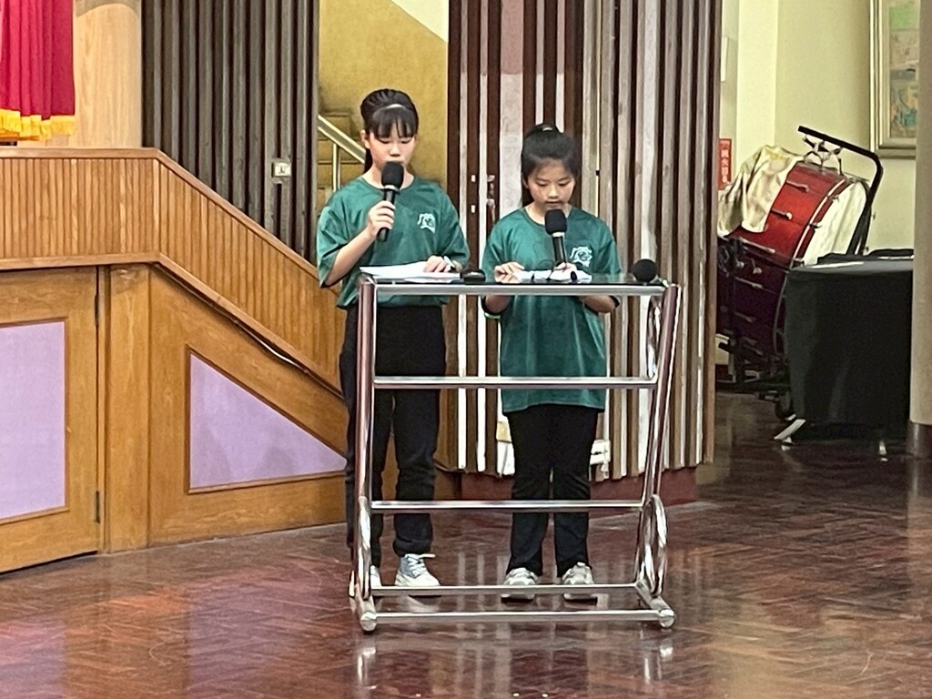本次活動另一大亮點,莫過於四位高年級主持人的優異表現。當他們站在繪有「精進卓越、感恩惜福」的壯麗背景前,高舉雙手向全場致意時,眼神中閃爍著自信與堅定。他們流暢地切換中英文,以幽默活潑的對話帶動現場氣氛,成為了舞台上最溫馨的守望者。