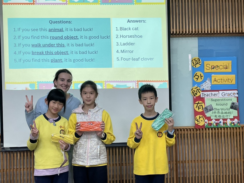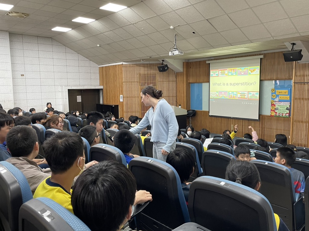 1月15日(四)與1月16日(五)第五節課,視聽教室熱鬧登場,主題為 「Superstitions Around The World 世界各地有趣迷信」。活動中,Teacher Grace 以生動活潑的方式,帶領學生認識不同國家千奇百怪又耐人尋味的迷信文化,從黑貓、幸運數字到生活中的小禁忌,引發孩子們陣陣驚呼與笑聲。