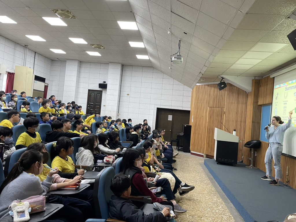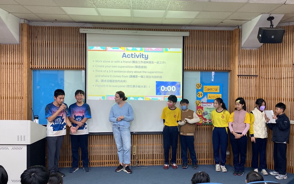 更令人驚喜的是,高年級學生也勇敢拿起麥克風,自信大方地用英文與 Grace 互動對話,分享自己或家人遇過的迷信小故事,還巧妙連結在地臺灣的生活經驗。現場超過百位師生彷彿置身一場小型國際交流,英語不再只是課本裡的文字,而是真實溝通的橋樑。