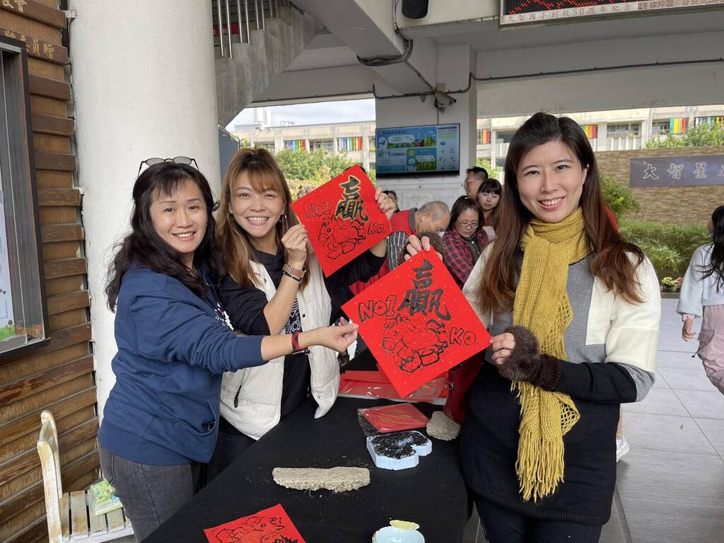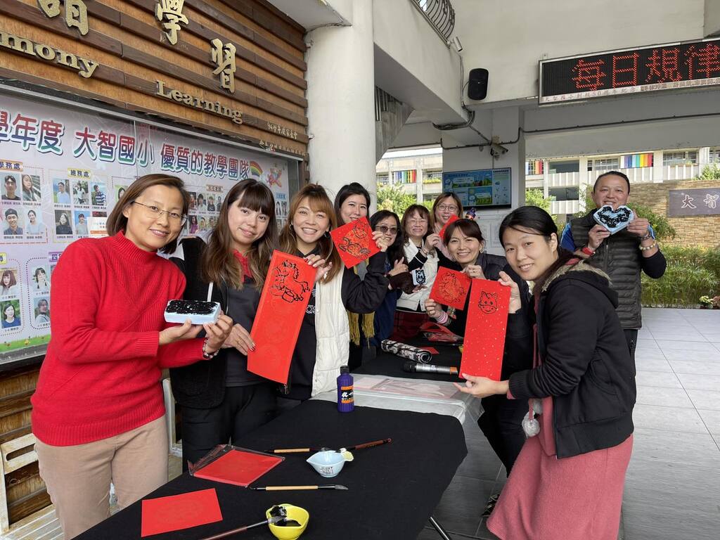~大智名家揮毫贈春聯~ 為營造年節喜氣,傳遞馬年帶來嶄新希望及正向力量,雅娟校長、強哥會長特別邀請本校退休教師書法名家許銀塗老師,傑出校友陳姝如老師,帶領家長會成員共同揮毫,送上新春祝福! 感謝許銀塗老師,大師功力非凡,字體蒼勁有力,許多學生、老師排隊索取! 感謝姝如老師、韻如老師帶來可愛的馬型拓印,讓大家愛不釋手! 感謝雅娟校長、強哥會長、雪盈隊長及委員們,帶給大家滿滿的祝福! 外師Alex也獻上她的第一次拿毛筆、寫春聯,小朋友都說Alex的字很漂亮呢!