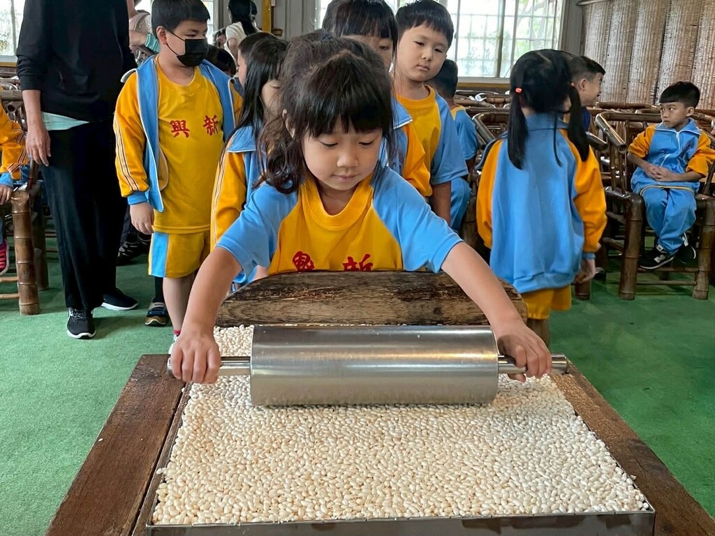 抵達農場後,在專業導覽老師的帶領下,首先進入了實作教室體驗「撕米粉」活動,孩子們學著用手輕輕撥開那一團團潔白細緻的米粉,感受米粉的韌性與質地。接著是「擀米香」的環節,小朋友們手握擀麵棍,專注地將香脆的米粒壓平。