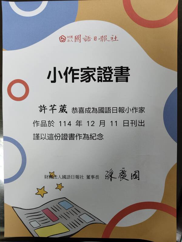 期許芊葳同學持續保持創作熱情,用文字記錄生活,發揮正向影響力。