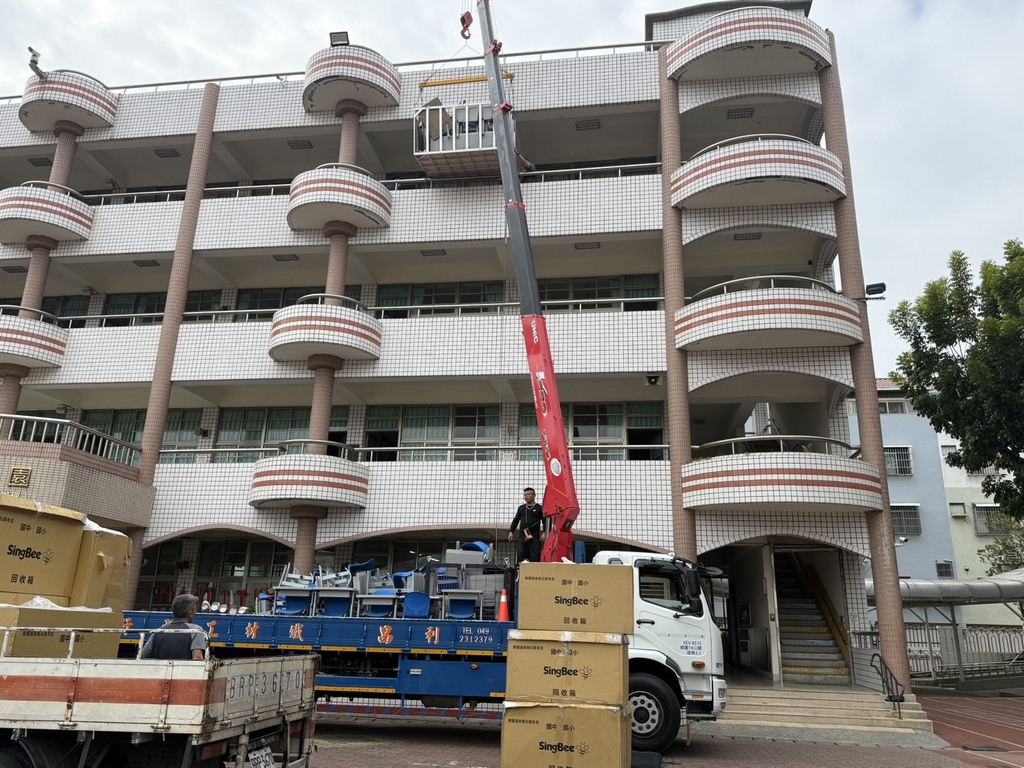 隨著清脆的搬運聲,一台大吊車正將一箱箱全新的可調整式課桌椅送往中年級教室。看著舊桌椅卸下,彷彿也卸下了過去數十年的歲月痕跡。負責同仁感觸地說:「看著孩子們每天趴在磨損的桌面上,心裡總有些不捨。」