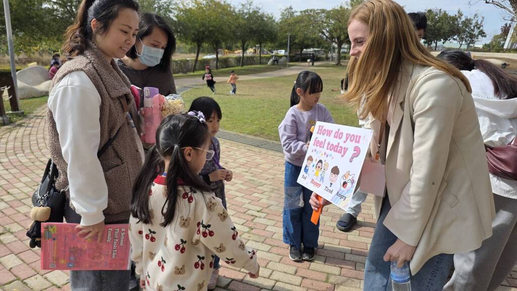在書香濃厚的東海圖書館,外師 Shari 與 Leon 說故事、做互動遊戲,孩子們完全沉浸在英語與繪本的奇妙世界。