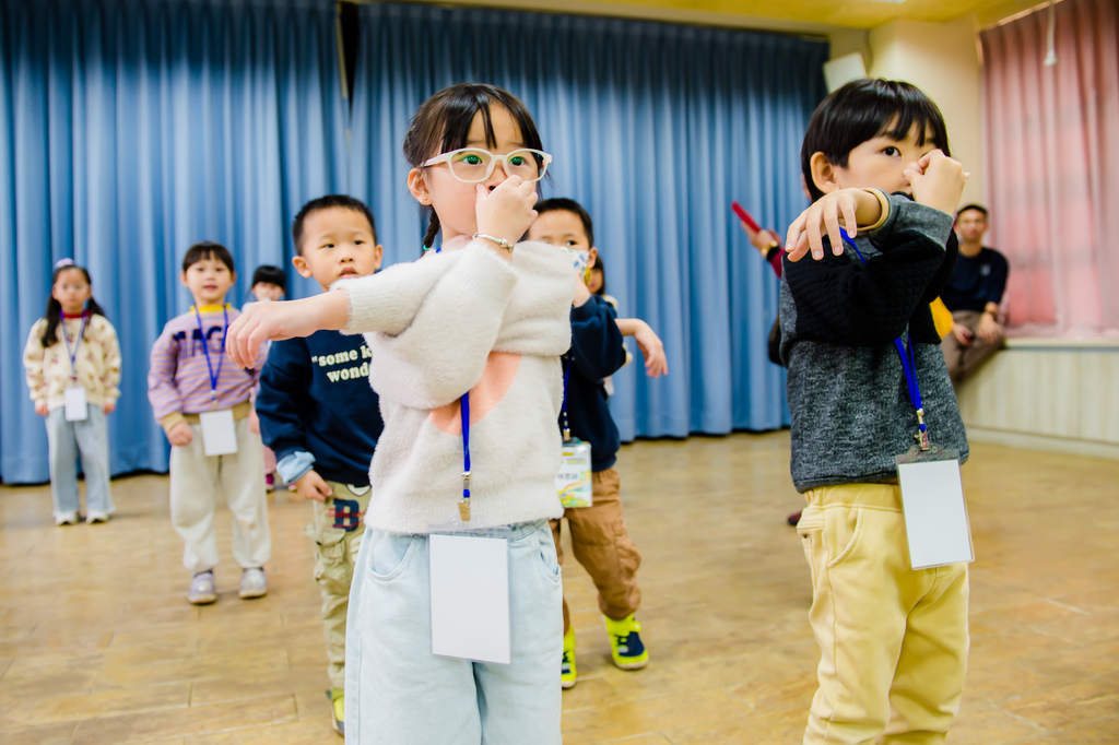 Tina 與 Savannah 老師帶著孩子模仿動物動作、跳舞伸展,孩子們玩得像是在舞台上變身的小明星。